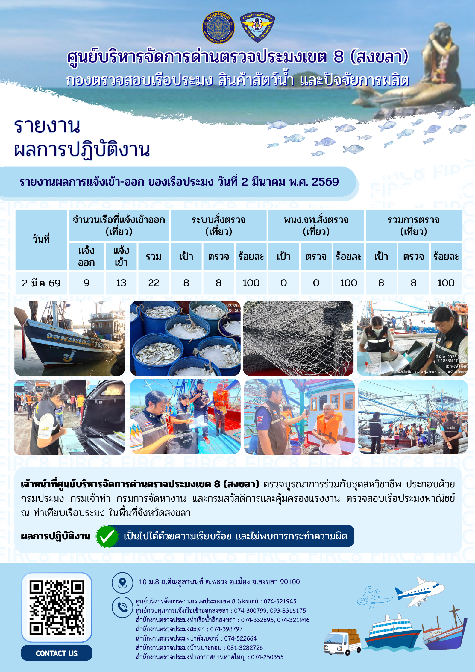 ผลการปฏิบัติงานศูนย์บริหารจัดการด่านตรวจประมงเขต 8 (สงขลา) ประจำวันที่ 2 มีนาคม 2569