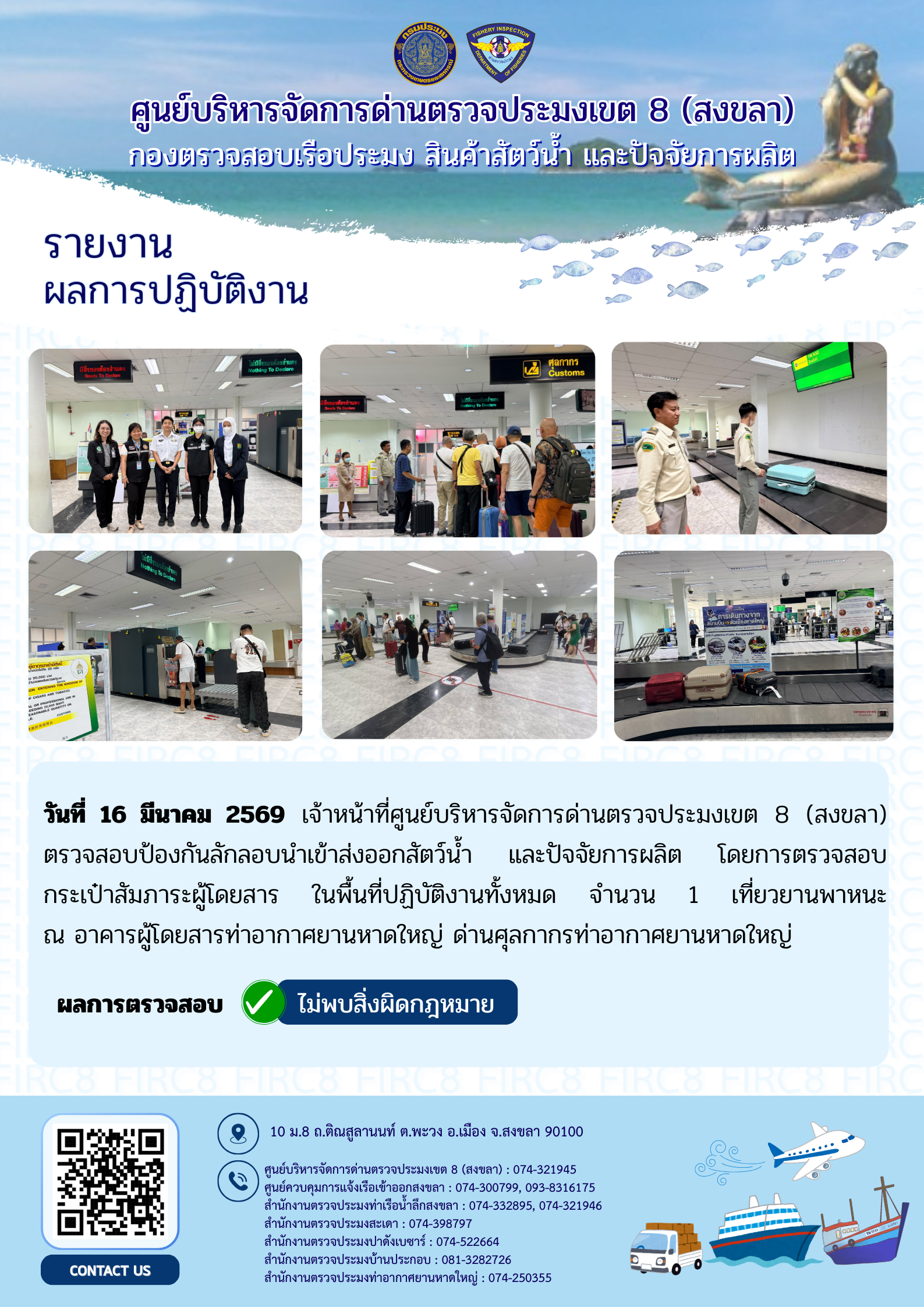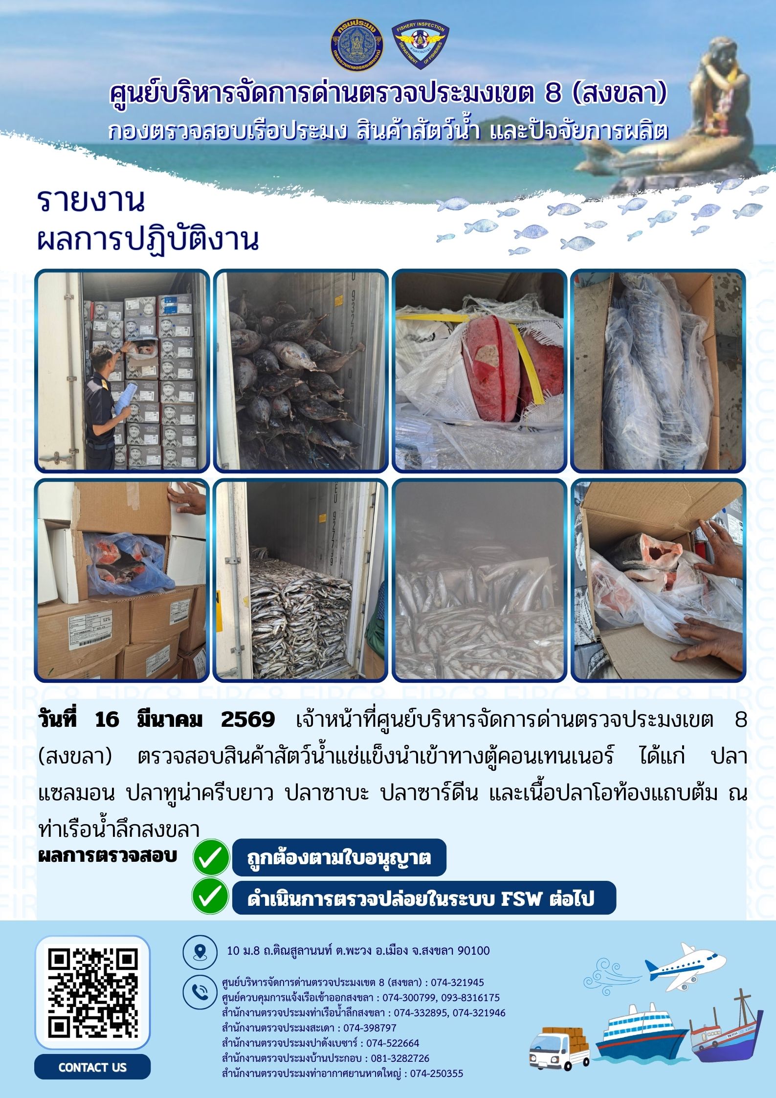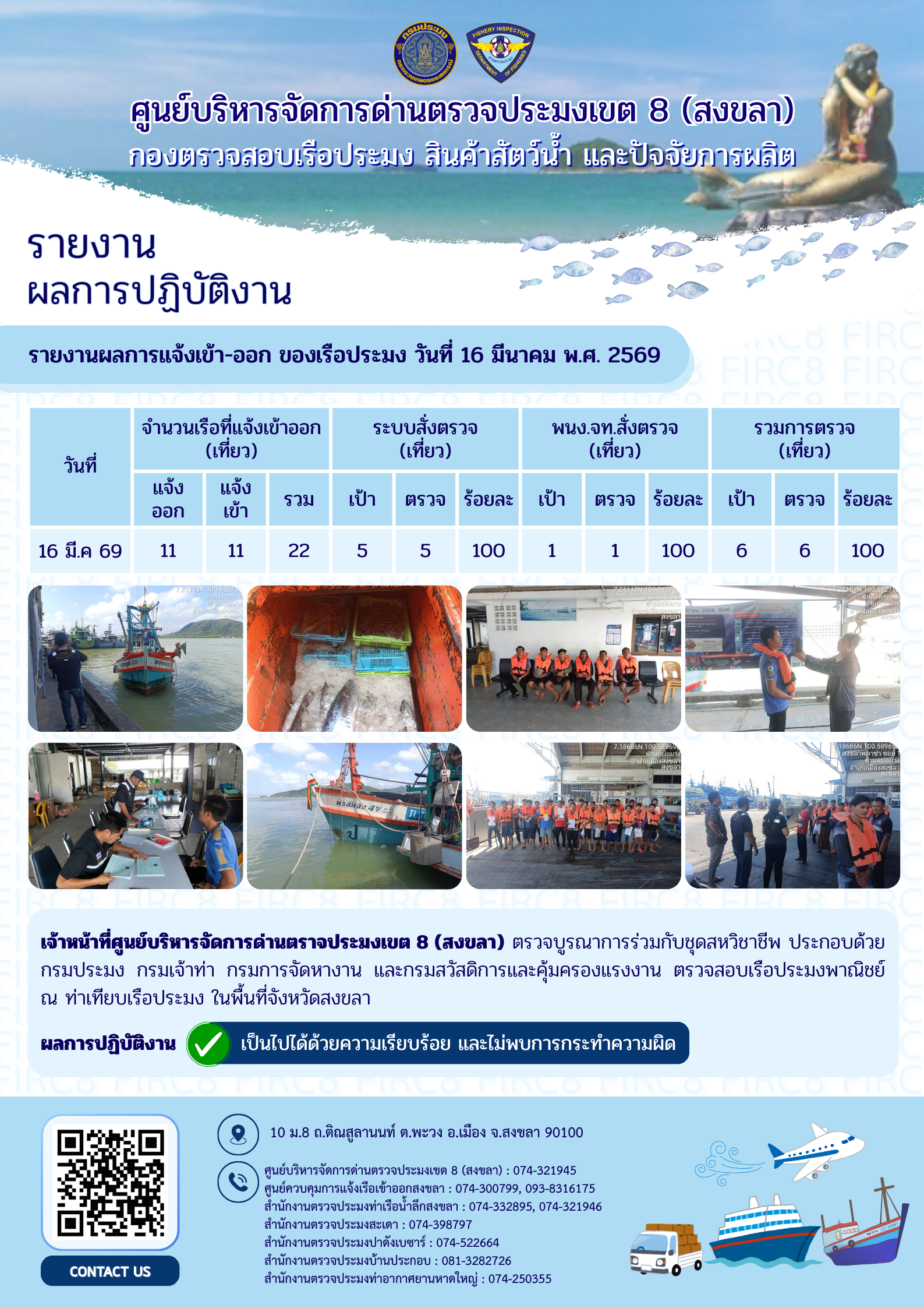 ผลการปฏิบัติงานศูนย์บริหารจัดการด่านตรวจประมงเขต 8 (สงขลา) ประจำวันที่ 16 มีนาคม 2569