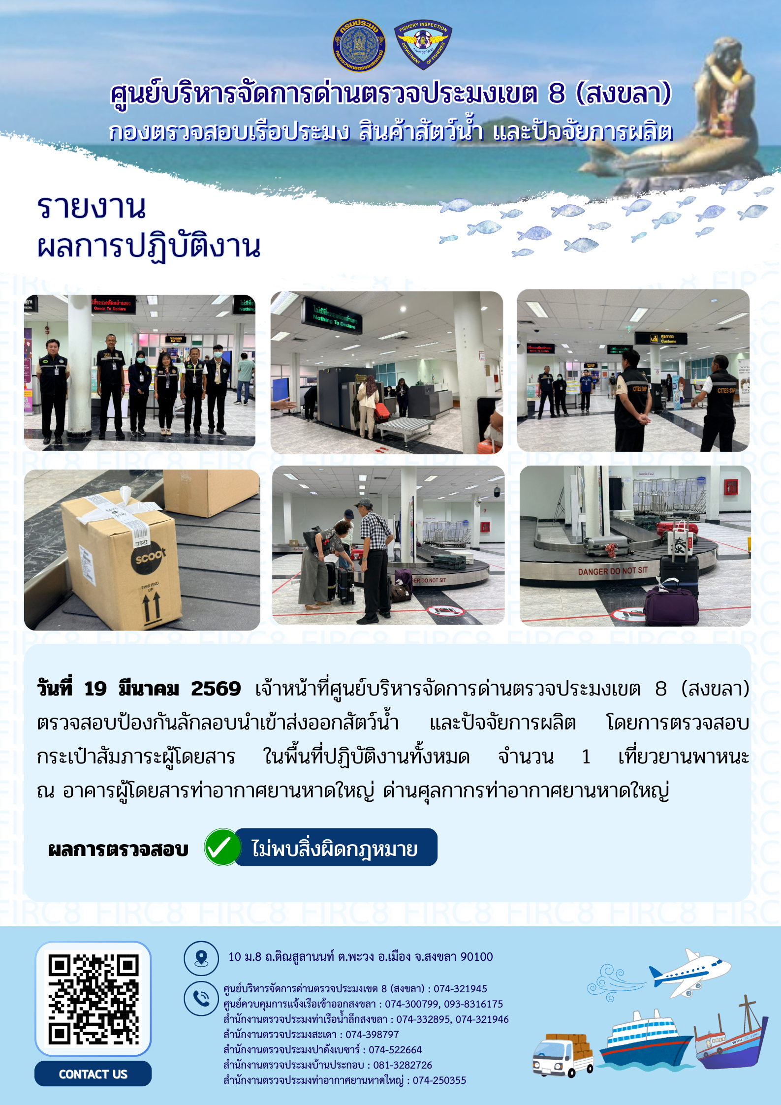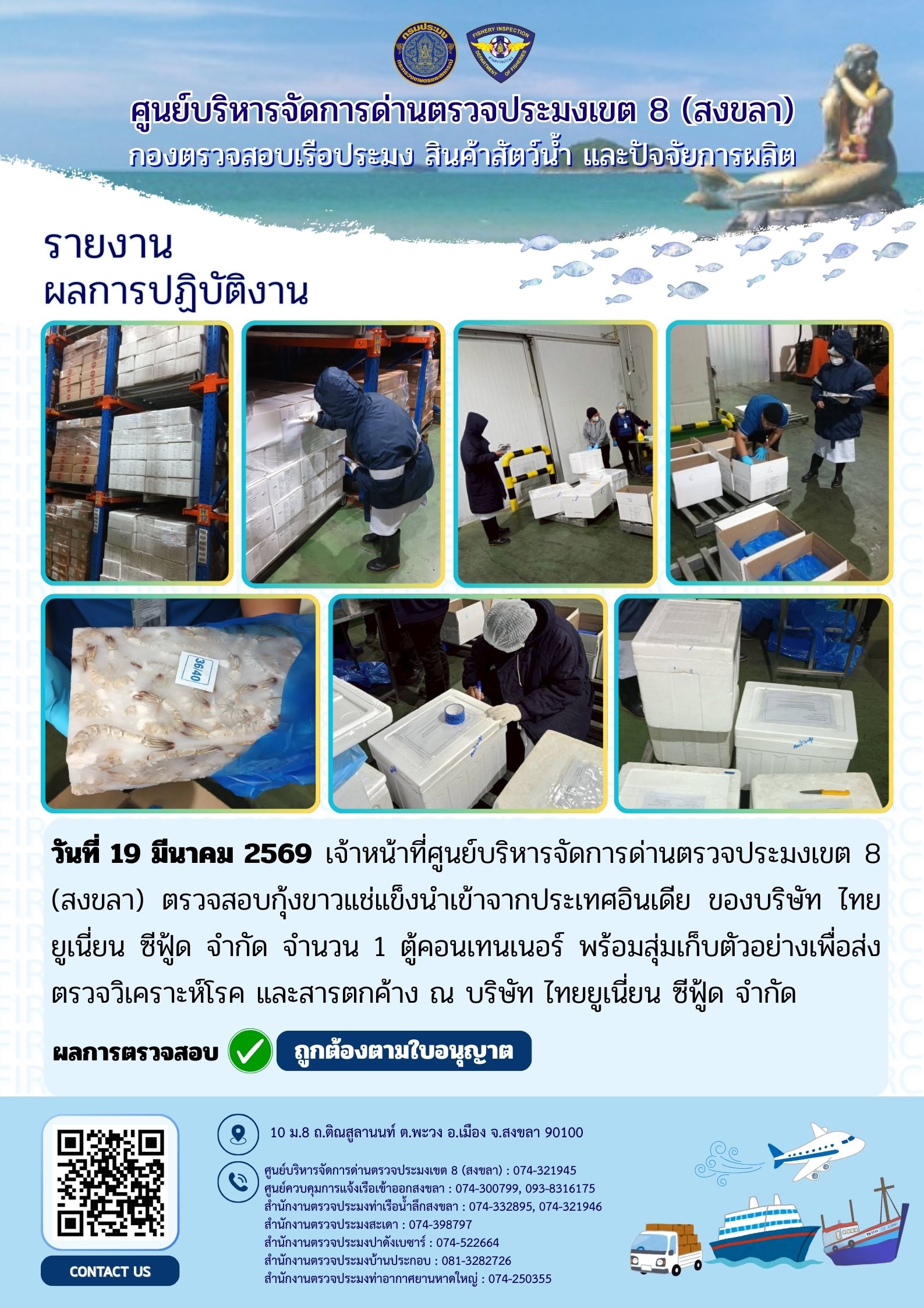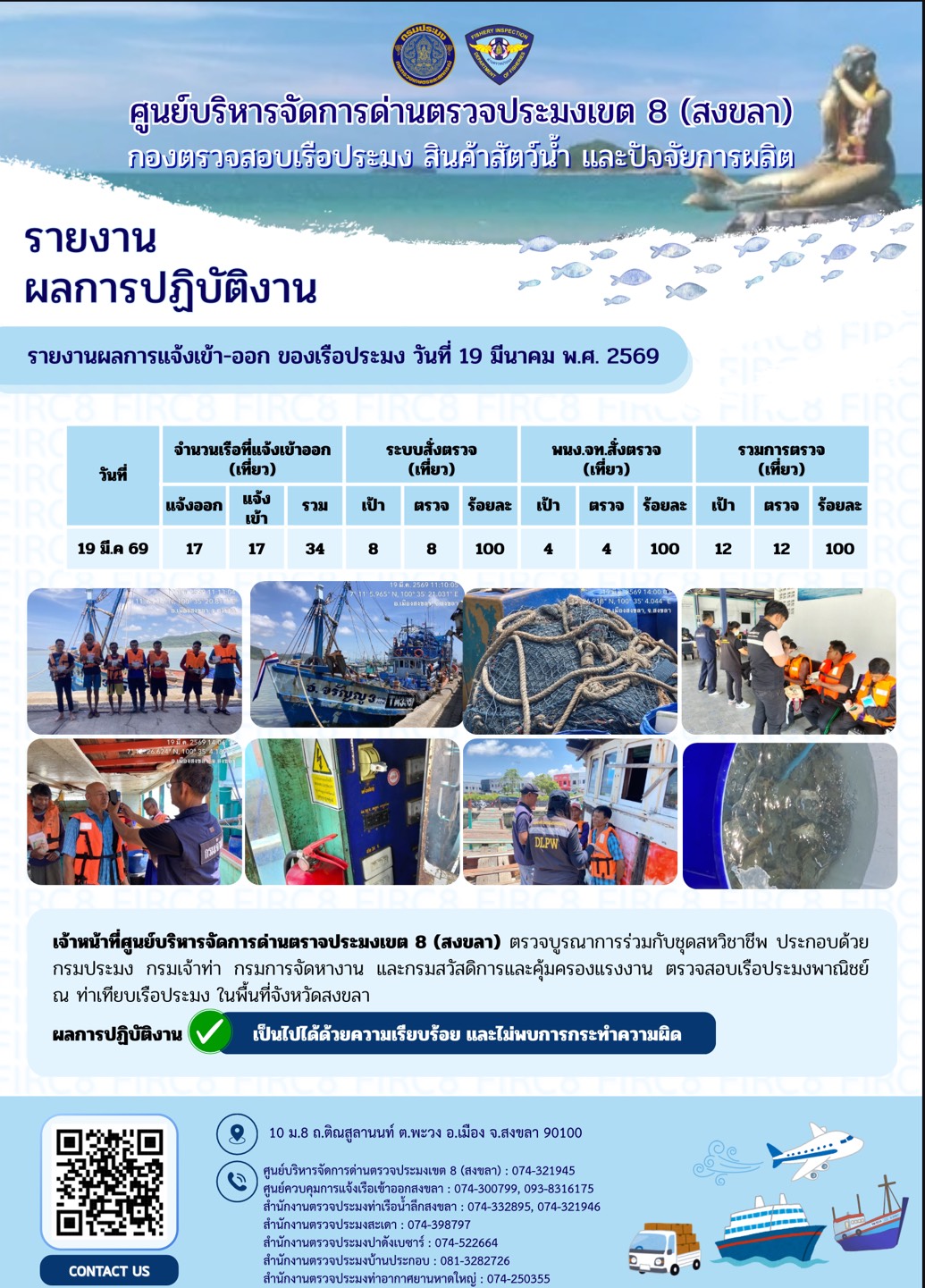 ผลการปฏิบัติงานศูนย์บริหารจัดการด่านตรวจประมงเขต 8 (สงขลา) ประจำวันที่ 19 มีนาคม 2569