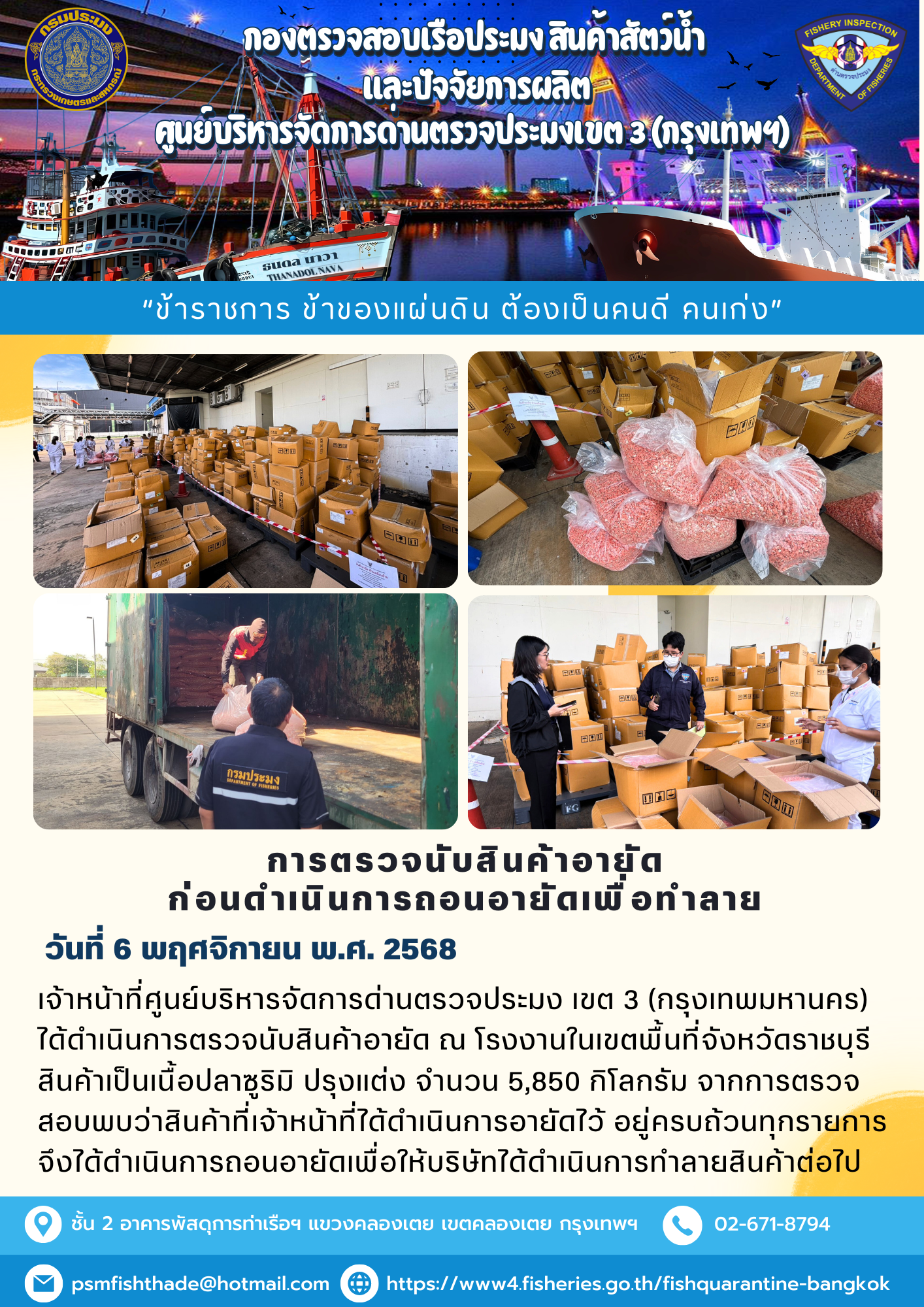 ประชาสัมพันธ์ศูนย์บริหารจัดการด่านตรวจประมงเขต 3 (กรุงเทพมหานคร) ประจำวันที่ 7 พฤศจิกายน 2568