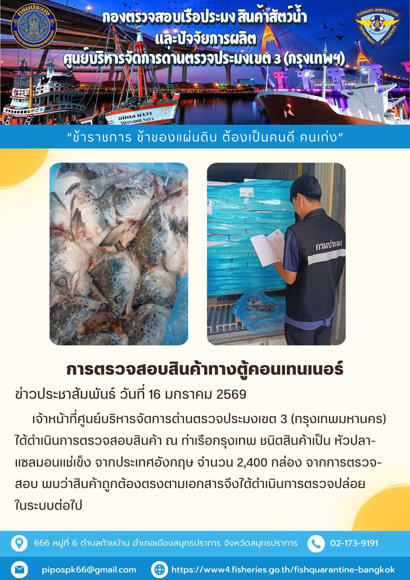 ประชาสัมพันธ์ศูนย์บริหารจัดการด่านตรวจประมงเขต 3 (กรุงเทพมหานคร) ประจำวันที่ 16 มกราคม 2569
