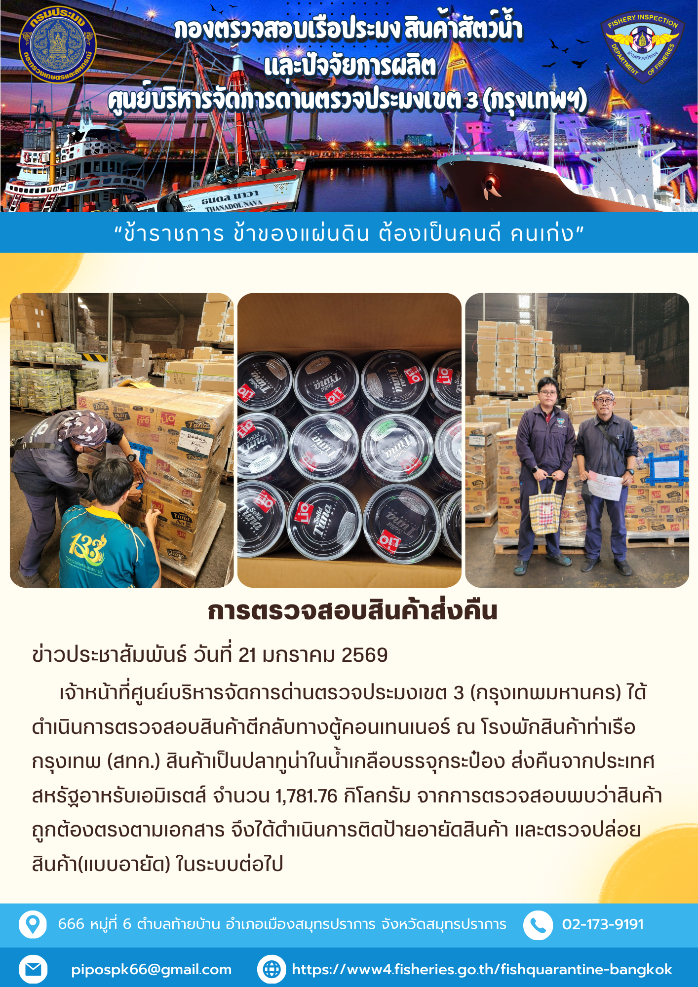 ประชาสัมพันธ์ศูนย์บริหารจัดการด่านตรวจประมงเขต 3 (กรุงเทพมหานคร) ประจำวันที่ 22 มกราคม 2569