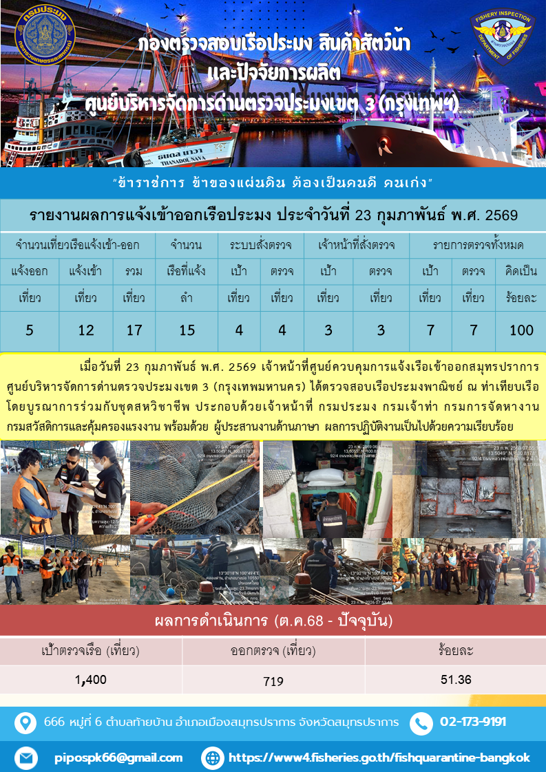 ประชาสัมพันธ์ศูนย์บริหารจัดการด่านตรวจประมงเขต 3 (กรุงเทพมหานคร) ประจำวันที่ 25 กุมภาพันธ์ 2569