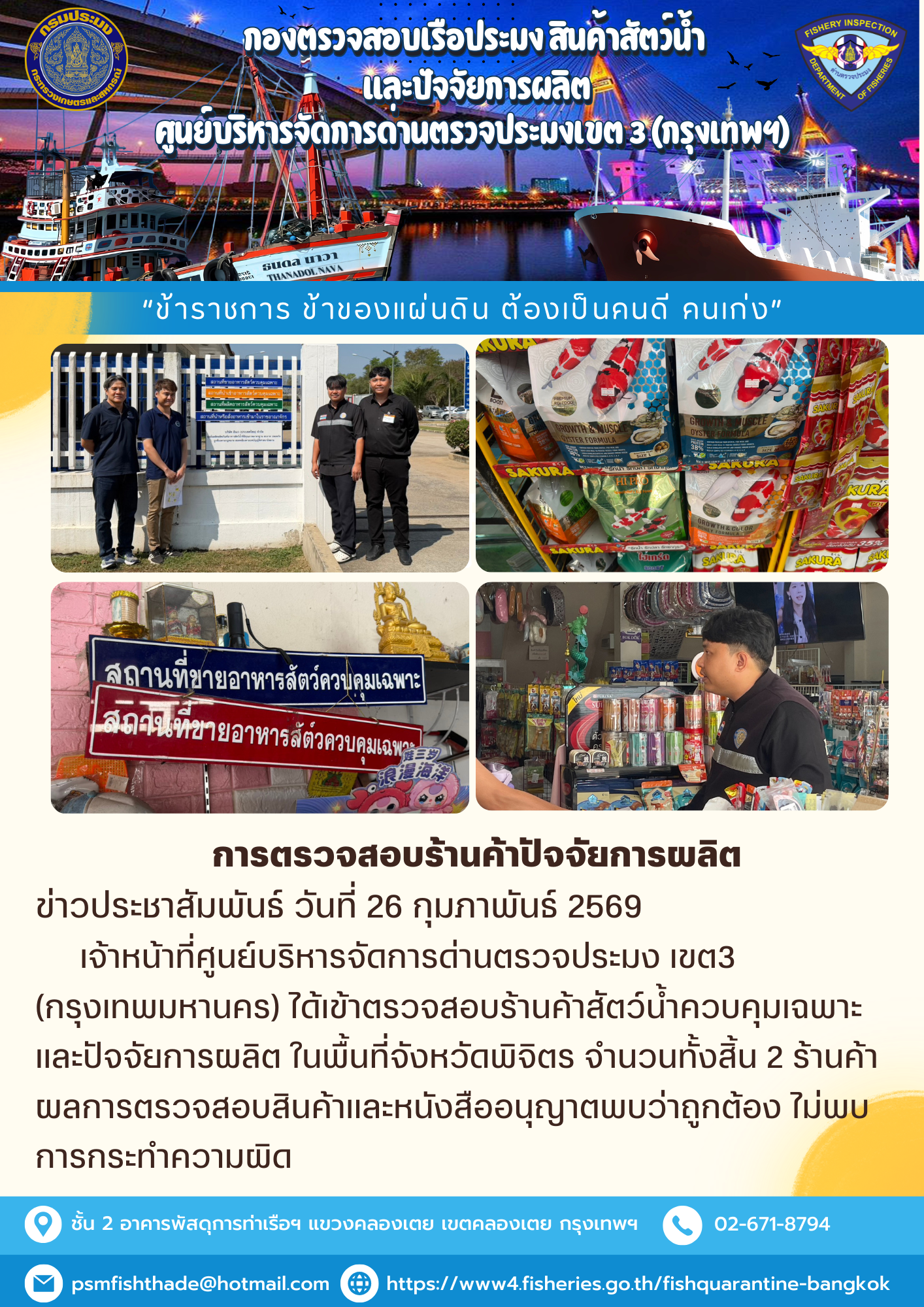 ประชาสัมพันธ์ศูนย์บริหารจัดการด่านตรวจประมงเขต 3 (กรุงเทพมหานคร) ประจำวันที่ 27 กุมภาพันธ์ 2569