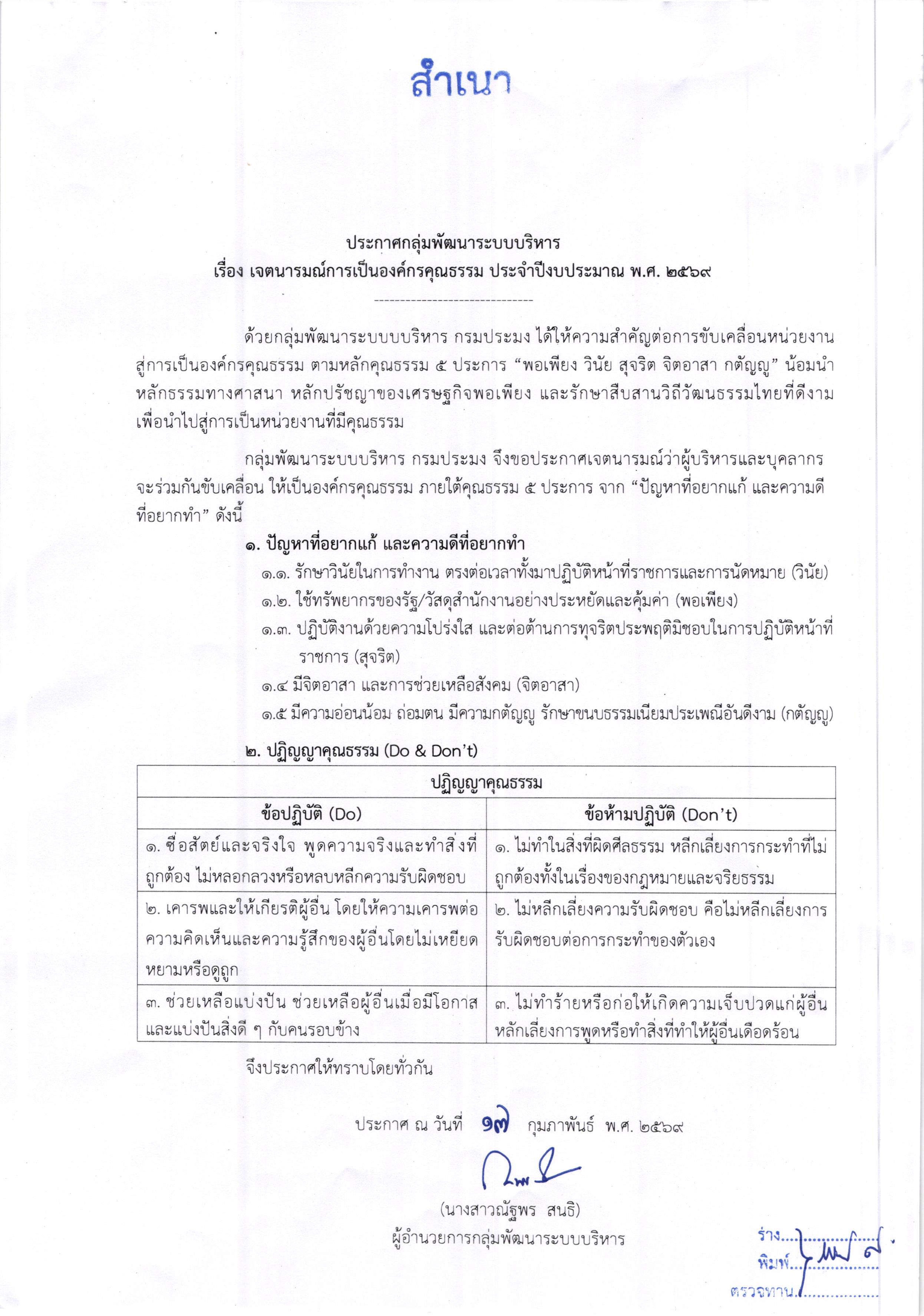 ประกาศเจตนารมณ์การเป็นองค์กรคุณธรรม ปี 2569