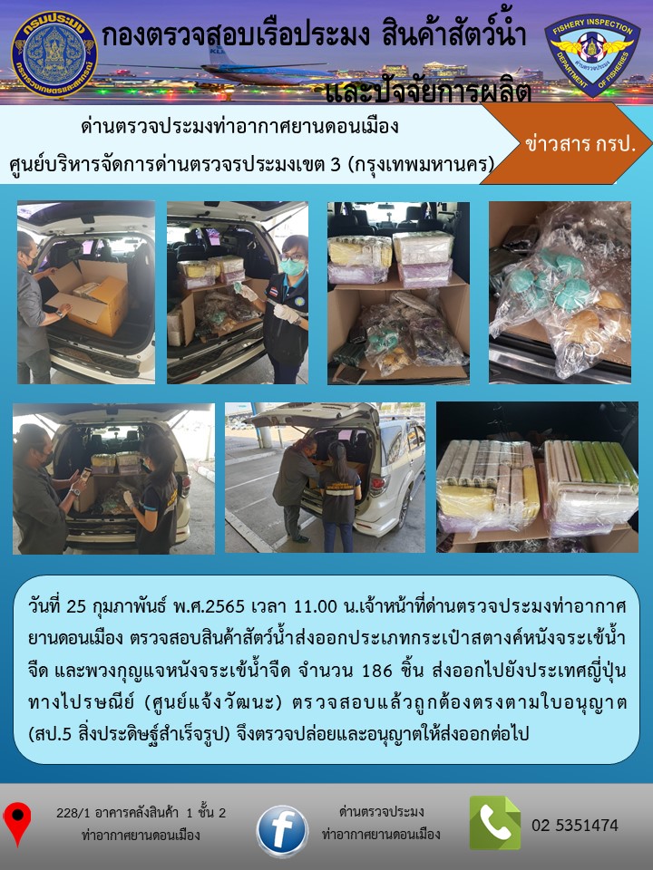 วันที่ 25 กุมภาพันธ์ พ.ศ.2565 เวลา 11.00 น.เจ้าหน้าที่ด่านตรวจประมงท่าอากาศยานดอนเมือง ตรวจสอบสินค้าสัตว์น้ำส่งออกประเภทกระเป๋าสตางค์หนังจระเข้น้ำจืด และพวงกุญแจหนังจระเข้น้ำจืด จำนวน 186 ชิ้น ส่งออกไปยังประเทศญี่ปุ่น ทางไปรษณีย์ (ศูนย์แจ้งวัฒนะ) ตรวจสอบแล้วถูกต้องตรงตามใบอนุญาต  (สป.5 สิ่งประดิษฐ์สำเร็จรูป) จึงตรวจปล่อยและอนุญาตให้ส่งออกต่อไป