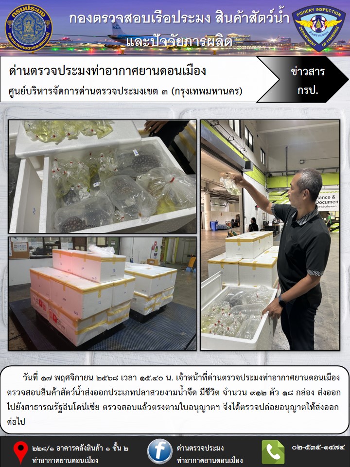 วันที่ 17 พฤศจิกายน 2568 เวลา 15.40 น. เจ้าหน้าที่ด่านตรวจประมงท่าอากาศยานดอนเมือง ตรวจสอบสินค้าสัตว์น้ำส่งออกประเภทปลาสวยงามน้ำจืด มีชีวิต จำนวน 912 ตัว 18 กล่อง ส่งออกไปยังสาธารณรัฐอินโดนีเซีย ตรวจสอบแล้วตรงตามใบอนุญาตฯ จึงได้ตรวจปล่อยอนุญาตให้ส่งออกต่อไป