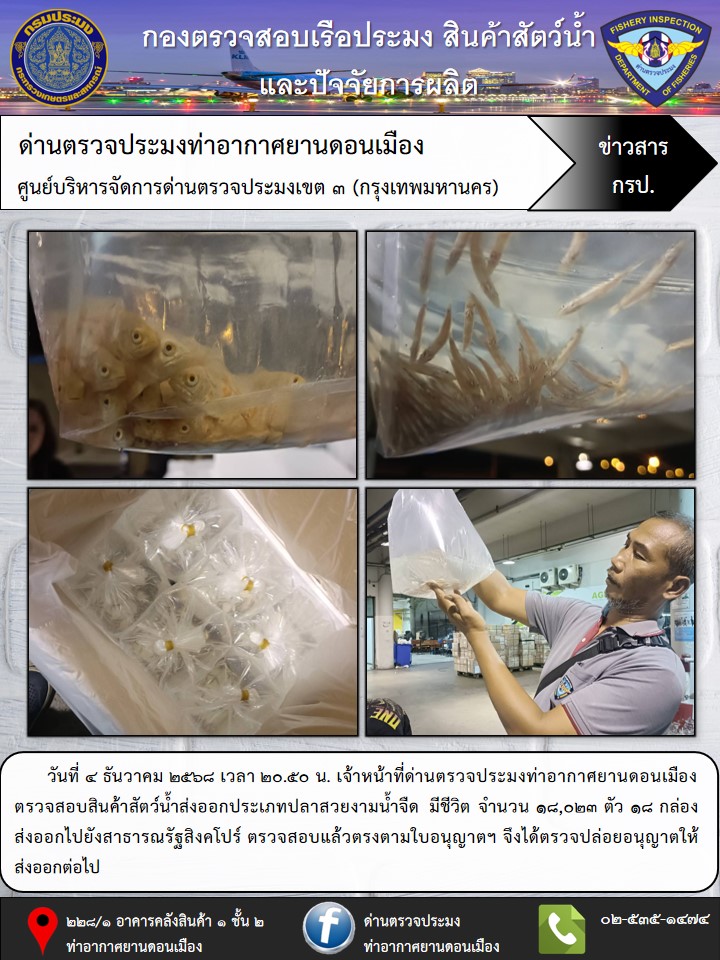 วันที่ 4 ธันวาคม 2568 เวลา 20.50 น. เจ้าหน้าที่ด่านตรวจประมงท่าอากาศยานดอนเมือง ตรวจสอบสินค้าสัตว์น้ำส่งออกประเภทปลาสวยงามน้ำจืด มีชีวิต จำนวน 18,023 ตัว 18 กล่อง ส่งออกไปยังสาธารณรัฐสิงคโปร์ ตรวจสอบแล้วตรงตามใบอนุญาตฯ จึงได้ตรวจปล่อยอนุญาตให้ส่งออกต่อไป