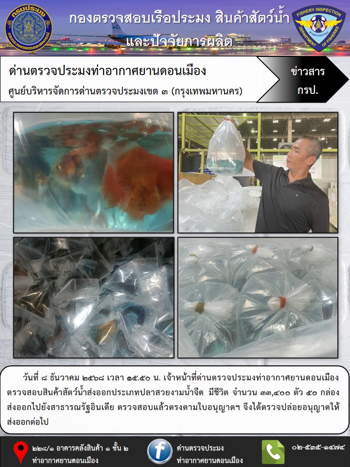 วันที่ 8 ธันวาคม 2568 เวลา 15.50 น. เจ้าหน้าที่ด่านตรวจประมงท่าอากาศยานดอนเมือง ตรวจสอบสินค้าสัตว์น้ำส่งออกประเภทปลาสวยงามน้ำจืด มีชีวิต จำนวน 33,400 ตัว 50 กล่อง ส่งออกไปยังสาธารณรัฐอินเดีย ตรวจสอบแล้วตรงตามใบอนุญาตฯ จึงได้ตรวจปล่อยอนุญาตให้ส่งออกต่อไป
