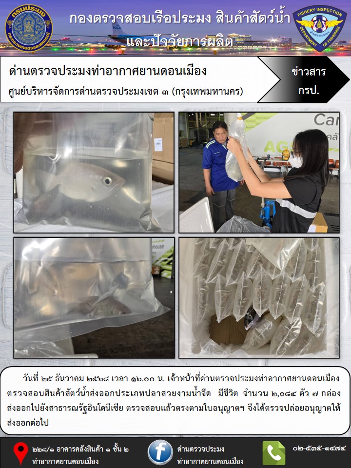 วันที่ 25 ธันวาคม 2568 เวลา 16.00 น. เจ้าหน้าที่ด่านตรวจประมงท่าอากาศยานดอนเมือง ตรวจสอบสินค้าสัตว์น้ำส่งออกประเภทปลาสวยงามน้ำจืด มีชีวิต จำนวน 2,084 ตัว 7 กล่อง ส่งออกไปยังสาธารณรัฐอินโดนีเซีย ตรวจสอบแล้วตรงตามใบอนุญาตฯ จึงได้ตรวจปล่อยอนุญาตให้ส่งออกต่อไป