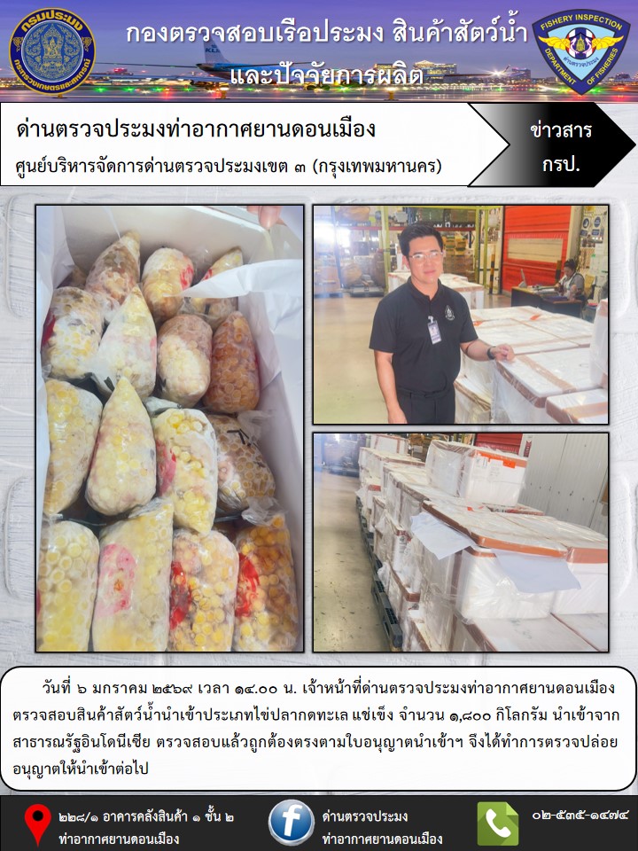 วันที่ 6 มกราคม 2569 เวลา 14.00 น. เจ้าหน้าที่ด่านตรวจประมงท่าอากาศยานดอนเมือง ตรวจสอบสินค้าสัตว์น้ำนำเข้าประเภทไข่ปลากดทะเล แช่เข็ง จำนวน 1,800 กิโลกรัม นำเข้าจากสาธารณรัฐอินโดนีเซีย ตรวจสอบแล้วถูกต้องตรงตามใบอนุญาตนำเข้าฯ จึงได้ทำการตรวจปล่อยอนุญาตให้นำเข้าต่อไป