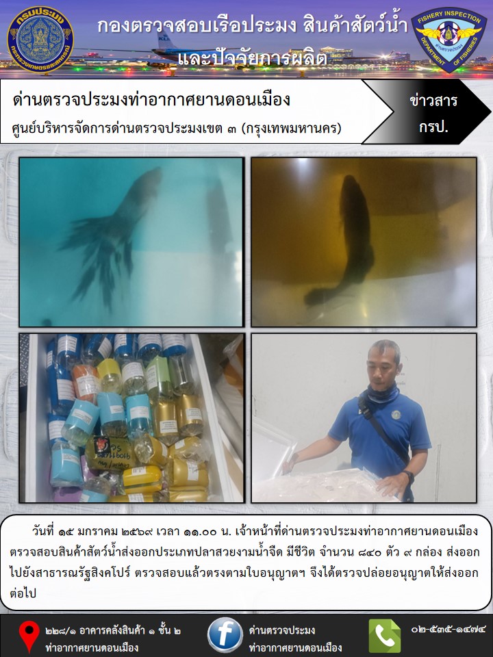 วันที่ 15 มกราคม 2569 เวลา 11.00 น. เจ้าหน้าที่ด่านตรวจประมงท่าอากาศยานดอนเมือง ตรวจสอบสินค้าสัตว์น้ำส่งออกประเภทปลาสวยงามน้ำจืด มีชีวิต จำนวน 840 ตัว 9 กล่อง ส่งออกไปยังสาธารณรัฐสิงคโปร์ ตรวจสอบแล้วตรงตามใบอนุญาตฯ จึงได้ตรวจปล่อยอนุญาตให้ส่งออกต่อไป