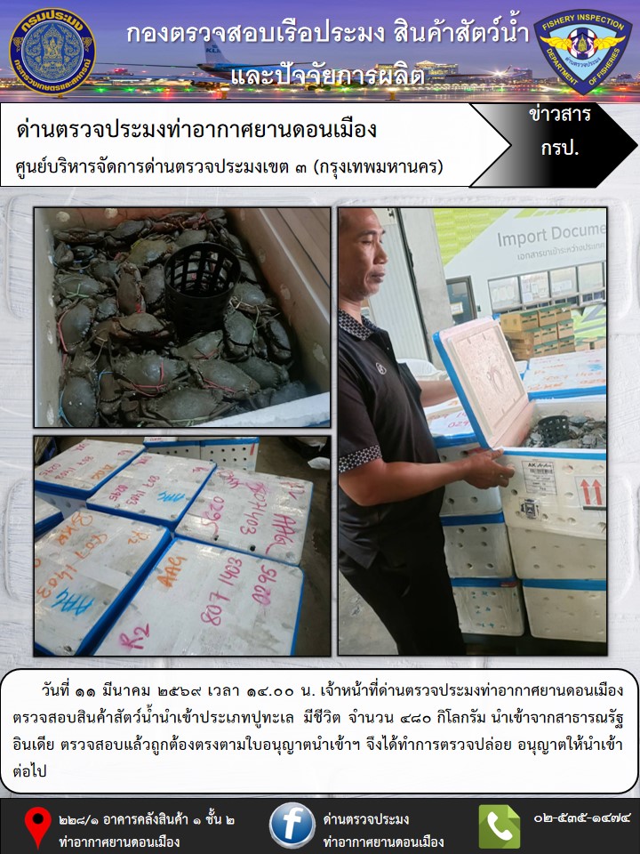 วันที่ 11 มีนาคม 2569 เวลา 14.00 น. เจ้าหน้าที่ด่านตรวจประมงท่าอากาศยานดอนเมือง ตรวจสอบสินค้าสัตว์น้ำนำเข้าประเภทปูทะเล มีชีวิต จำนวน 480 กิโลกรัม นำเข้าจากสาธารณรัฐอินเดีย ตรวจสอบแล้ว ถูกต้องตรงตามใบอนุญาตนำเข้าฯ จึงได้ทำการตรวจปล่อยอนุญาตให้นำเข้าต่อไป