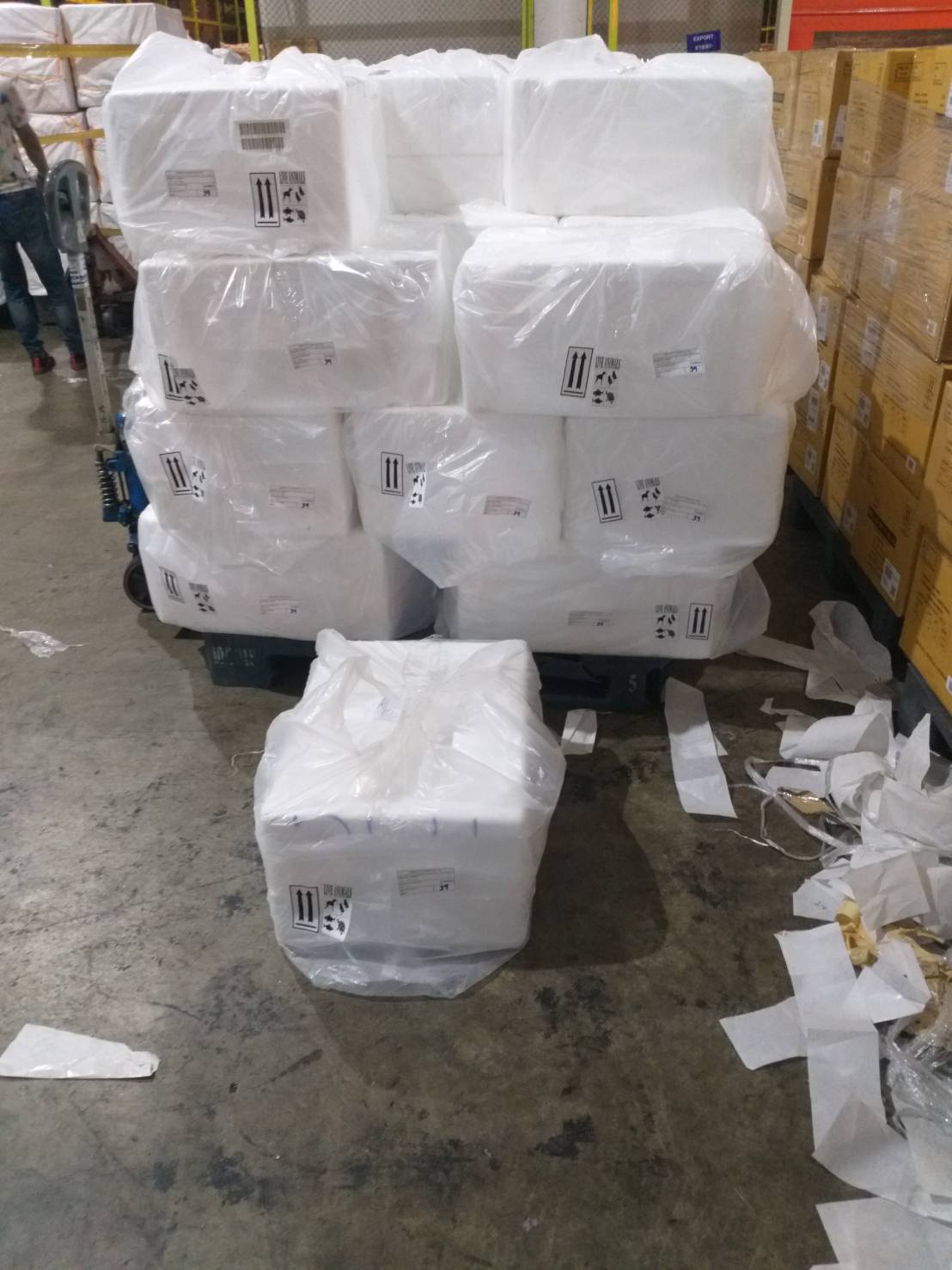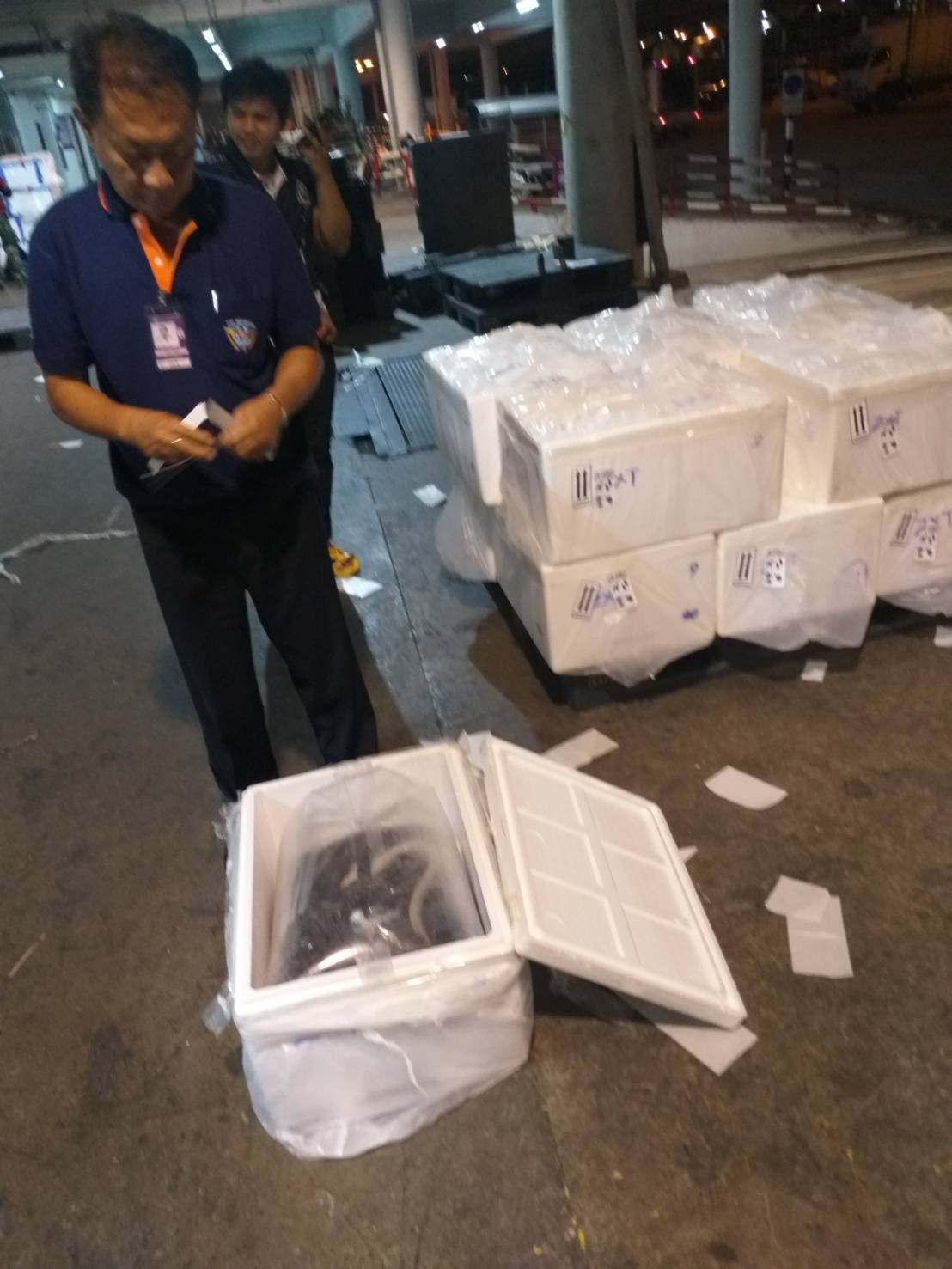 วันที่ 23 ตุลาคม 2562 เวลา 03.00 น. เจ้าหน้าที่ด่านตรวจสัตว์น้ำท่าอากาศยานดอนเมืองตรวจสอบสินค้าสัตว์น้ำส่งออก 2 ใบอนุญาต ประเภทกุ้งขาวมีชีวิตเพื่อบริโภค จำนวน 39 กล่อง น้ำหนัก 468 กิโลกรัม และ ปลาตูหนามีชีวิตเพื่อบริโภค จำนวน 11 กล่อง น้ำหนัก 220 กิโลกรัม ส่งออกไปยังสาธารณรัฐประชาชนจีน เที่ยวบินที่ FD/556 และ FD/850 ตรวจสอบถูกต้องตรงตามใบอนุญาต จึงได้ออกใบรับรองสัตว์น้ำมีชีวิตเพื่อการบริโภคส่งออกไปสาธารณรัฐประชาชนจีน และอนุญาตให้ส่งออกต่อไป