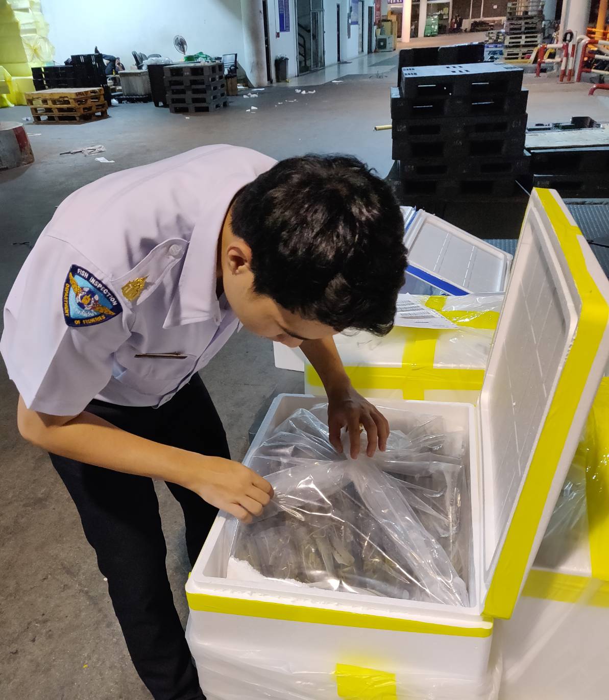 วันที่ 24 ตุลาคม 2562 เวลา 04.35 น. เจ้าหน้าที่ด่านตรวจสัตว์น้ำท่าอากาศยานดอนเมือง ตรวจสอบสินค้าสัตว์น้ำส่งออก จำนวน 3 ใบอนุญาต ประเภทกั้งตั๊กแตนมีชีวิต น้ำหนัก 40, 50 และ 100 กิโลกรัม จำนวน 4, 5 และ 10 กล่อง ส่งออกไปยังเขตบริหารพิเศษมาเก๊า เที่ยวบินที่ FD/760 ตรวจสอบถูกต้องตรงตามใบอนุญาตส่งออก จึงตรวจปล่อยอนุญาตให้ส่งออกต่อไป
