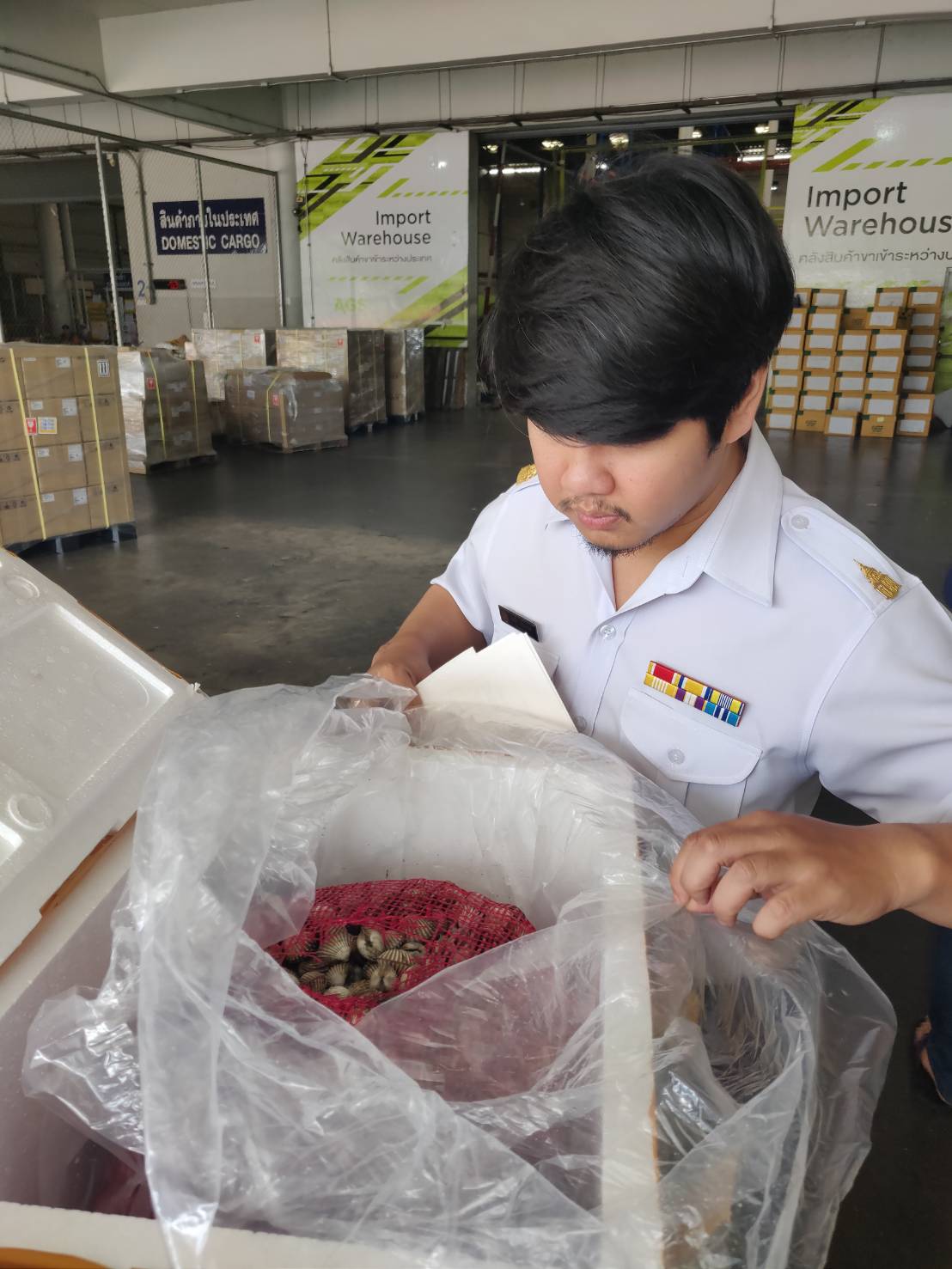 วันที่ 25 ตุลาคม 2562 เวลา 15.00 น. เจ้าหน้าที่ด่านตรวจสัตว์น้ำท่าอากาศยานดอนเมือง ตรวจสอบสินค้าสัตว์น้ำนำเข้า 2 ใบอนุญาต ประเภทหอยแครงมีชีวิต จำนวน 39 และ 32 กล่อง น้ำหนัก 858 และ 705 กิโลกรัม เที่ยวบินที่ QZ/154 นำเข้ามาจากประเทศอินโดนีเซีย ตรวจสอบแล้วถูกต้องตรงตามใบอนุญาตนำเข้า จึงตรวจปล่อยอนุญาตให้นำเข้าต่อไป