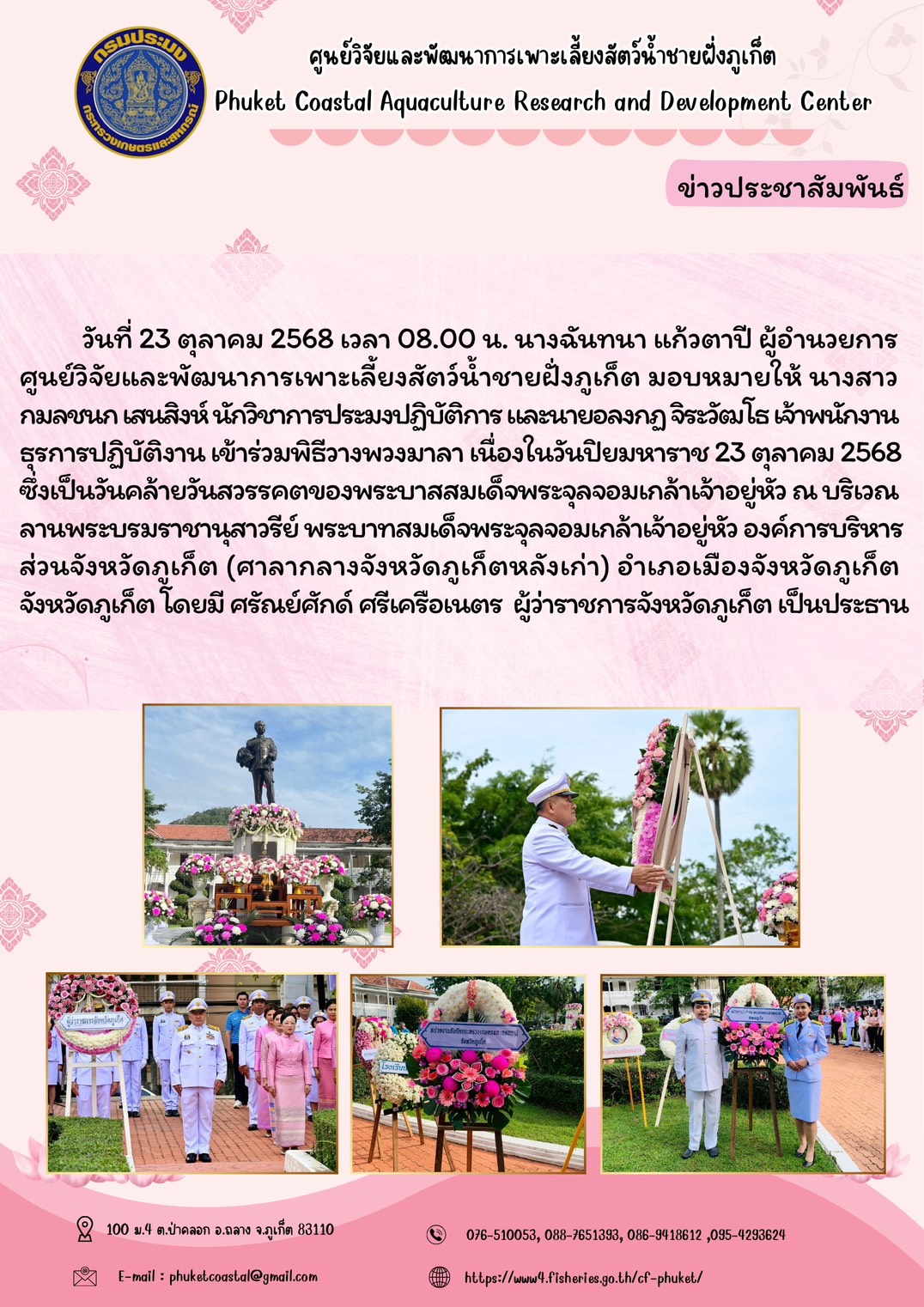 วันที่ 23 ตุลาคม 2568 เวลา 08.00 น. นางฉันทนา แก้วตาปี ผู้อำนวยการศูนย์วิจัยและพัฒนาการเพาะเลี้ยงสัตว์น้ำชายฝั่งภูเก็ต มอบหมายให้ นางสาวกมลชนก เสนสิงห์ นักวิชาการประมงปฏิบัติการ และนายอลงกฏ จิระวัฒโธ เจ้าพนักงานธุรการปฏิบัติงาน เข้าร่วมพิธีวางพวงมาลา เนื่องในวันปิยมหาราช 23 ตุลาคม 2568 ซึ่งเป็นวันคล้ายวันสวรรคตของพระบาสสมเด็จพระจุลจอมเกล้าเจ้าอยู่หัว ณ บริเวณลานพระบรมราชานุสาวรีย์ พระบาทสมเด็จพระจุลจอมเกล้าเจ้าอยู่หัว องค์การบริหารส่วนจังหวัดภูเก็ต (ศาลากลางจังหวัดภูเก็ตหลังเก่า) อำเภอเมืองจังหวัดภูเก็ตจังหวัดภูเก็ต โดยมี ศรัณย์ศักด์ ศรีเครือเนตร ผู้ว่าราชการจังหวัดภูเก็ต เป็นประธาน