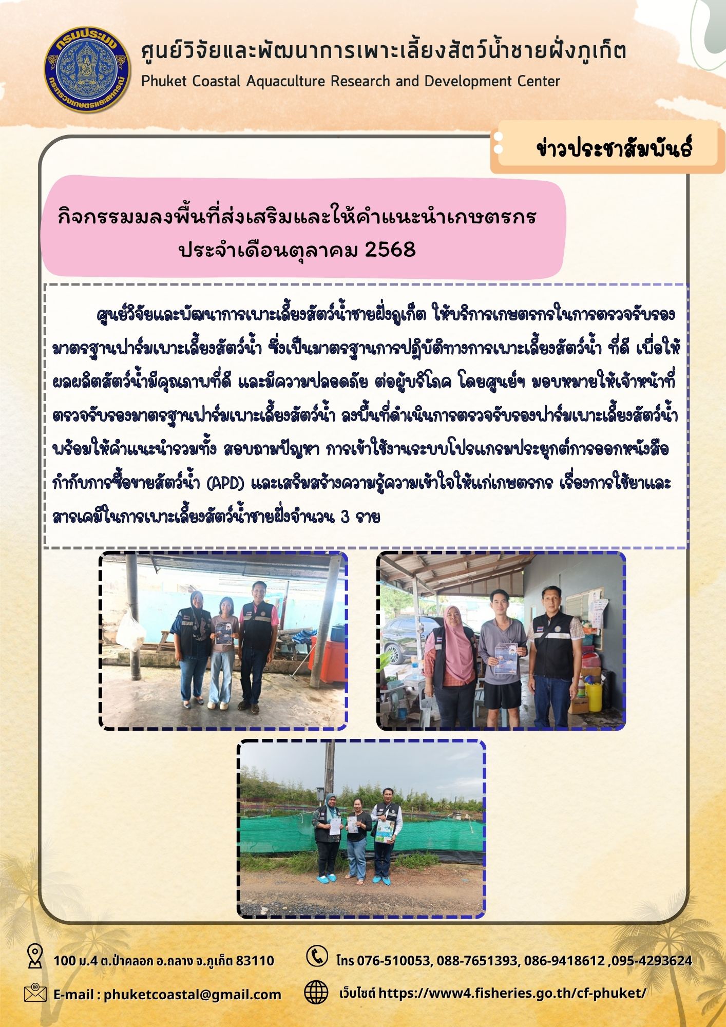ศูนย์วิจัยและพัฒนาการเพาะเลี้ยงสัตว์น้ำชายฝั่งภูเก็ต ให้บริการเกษตรกรในการตรวจรับรองมาตรฐานฟาร์มเพาะเลี้ยงสัตว์น้ำ ซึ่งเป็นมาตรฐานการปฏิบัติทางการเพาะเลี้ยงสัตว์น้ำ ที่ดี เพื่อให้ผลผลิตสัตว์น้ำมีคุณภาพที่ดี และมีความปลอดภัย ต่อผู้บริโภค โดยศูนย์ฯ มอบหมายให้เจ้าหน้าที่ตรวจรับรองมาตรฐานฟาร์มเพาะเลี้ยงสัตว์น้ำ ลงพื้นที่ดำเนินการตรวจรับรองฟาร์มเพาะเลี้ยงสัตว์น้ำพร้อมให้คำแนะนำรวมทั้ง สอบถามปัญหา การเข้าใช้งานระบบโปรแกรมประยุกต์การออกหนังสือกำกับการซื้อขายสัตว์น้ำ (APD) และเสริมสร้างความรู้ความเข้าใจให้แก่เกษตรกร เรื่องการใช้ยาและสารเคมีในการเพาะเลี้ยงสัตว์น้ำชายฝั่งจำนวน 3 ราย