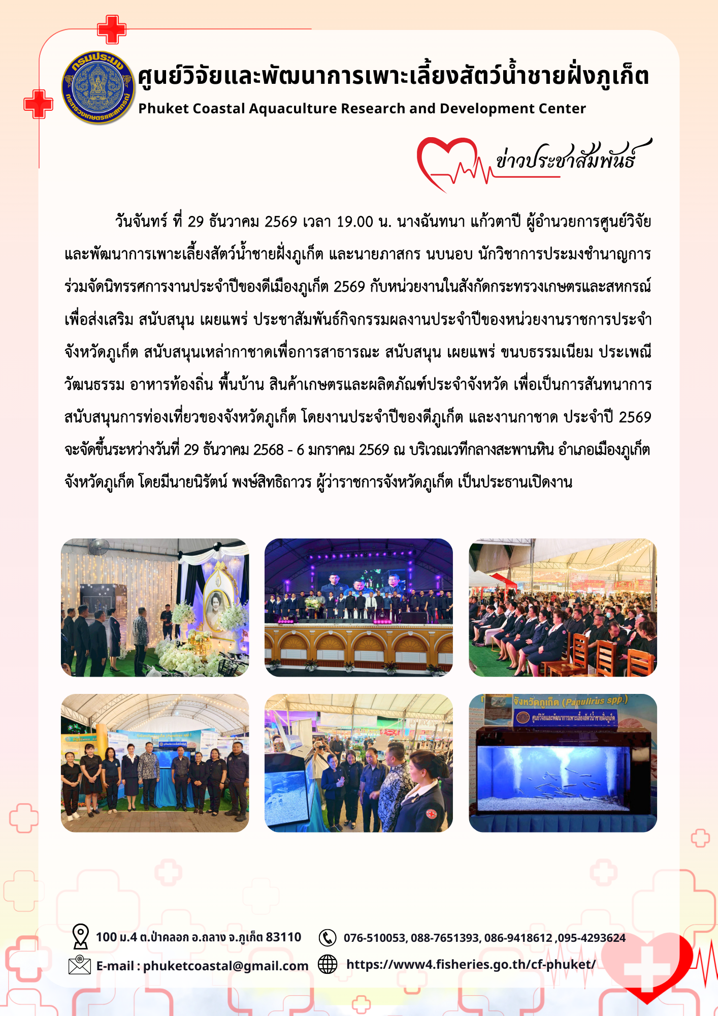 วันจันทร์ ที่ 29 ธันวาคม 2569 เวลา 19.00 น. นางฉันทนา แก้วตาปี ผู้อำนวยการศูนย์วิจัยและพัฒนาการเพาะเลี้ยงสัตว์น้ำชายฝั่งภูเก็ต และนายภาสกร นบนอบ นักวิชาการประมงชำนาญการ ร่วมจัดนิทรรศการงานประจำปีของดีเมืองภูเก็ต 2569 กับหน่วยงานในสังกัดกระทรวงเกษตรและสหกรณ์ เพื่อส่งเสริม สนับสนุน เผยแพร่ ประชาสัมพันธ์กิจกรรมผลงานประจำปีของหน่วยงานราชการประจำจังหวัดภูเก็ต สนับสนุนเหล่ากาชาดเพื่อการสาธารณะ สนับสนุน เผยแพร่ ขนบธรรมเนียม ประเพณี วัฒนธรรม อาหารท้องถิ่น พื้นบ้าน สินค้าเกษตรและผลิตภัณฑ์ประจำจังหวัด เพื่อเป็นการสันทนาการสนับสนุนการท่องเที่ยวของจังหวัดภูเก็ต โดยงานประจำปีของดีภูเก็ต และงานกาชาด ประจำปี 2569 จะจัดขึ้นระหว่างวันที่ 29 ธันวาคม 2568 - 6 มกราคม 2569 ณ บริเวณเวทีกลางสะพานหิน อำเภอเมืองภูเก็ต จังหวัดภูเก็ต โดยมีนายนิรัตน์ พงษ์สิทธิถาวร ผู้ว่าราชการจังหวัดภูเก็ต เป็นประธานเปิดงาน
