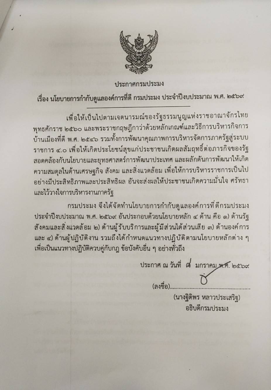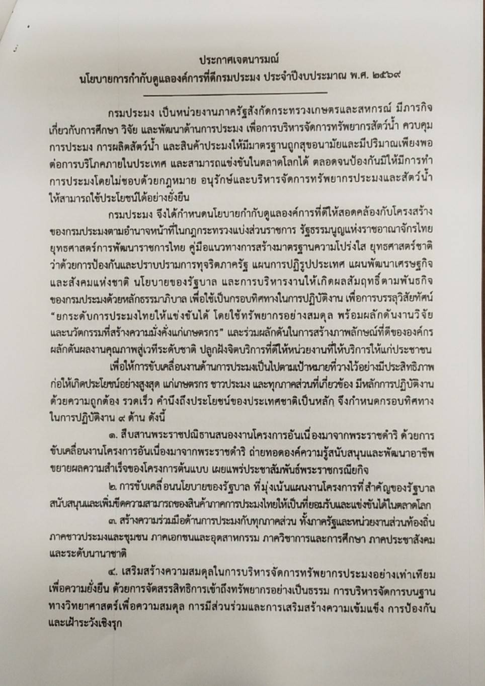 เรื่อง นโยบายการกำกับดูแลองค์การที่ดี กรมประมง ประจำปีงบประมาณ พ.ศ.2569
