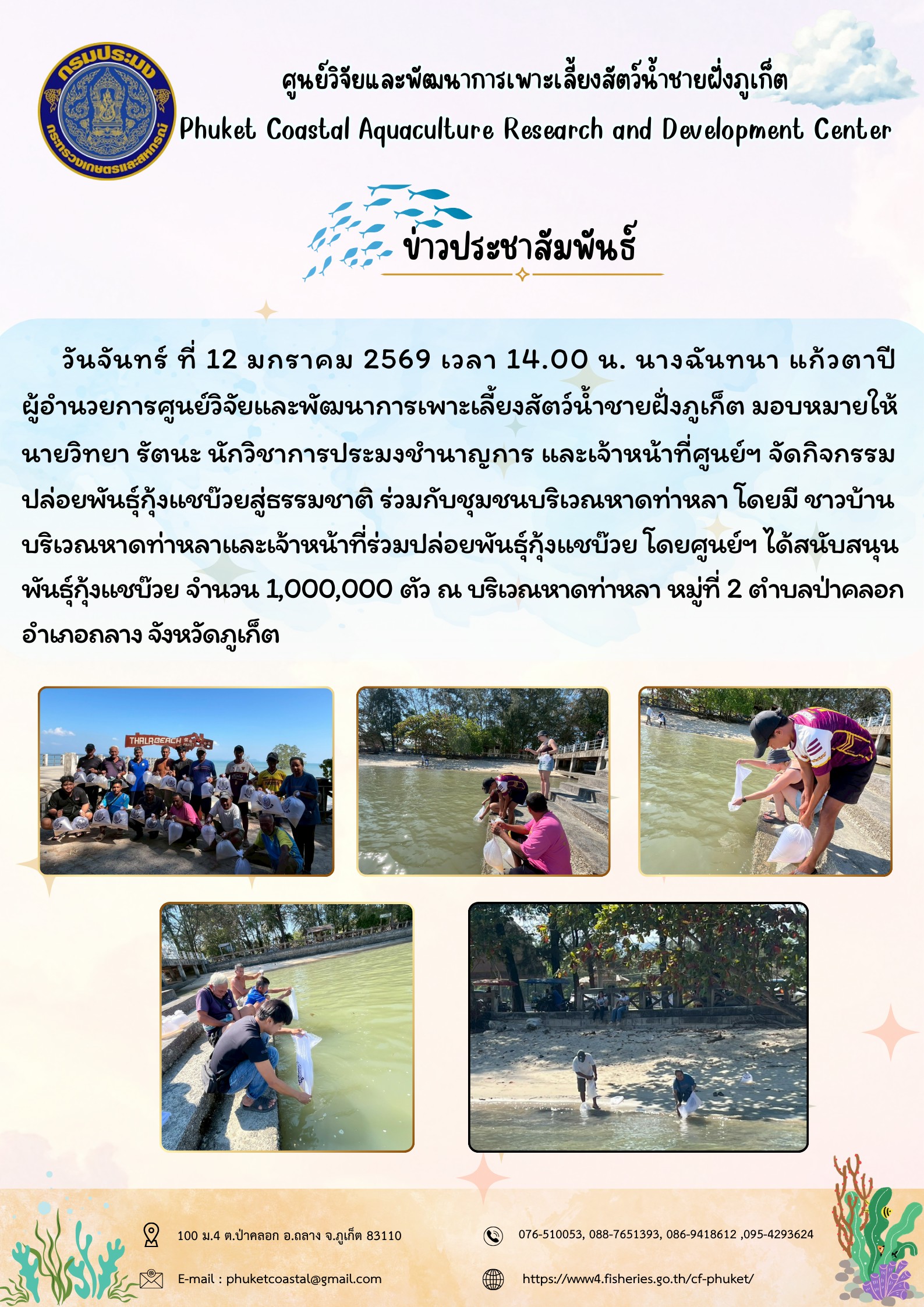วันจันทร์ ที่ 12 มกราคม 2569 เวลา 14.00 น. จัดกิจกรรมปล่อยพันธุ์กุ้งแชบ๊วยสู่ธรรมชาติ ร่วมกับชุมชนบริเวณหาดท่าหลา