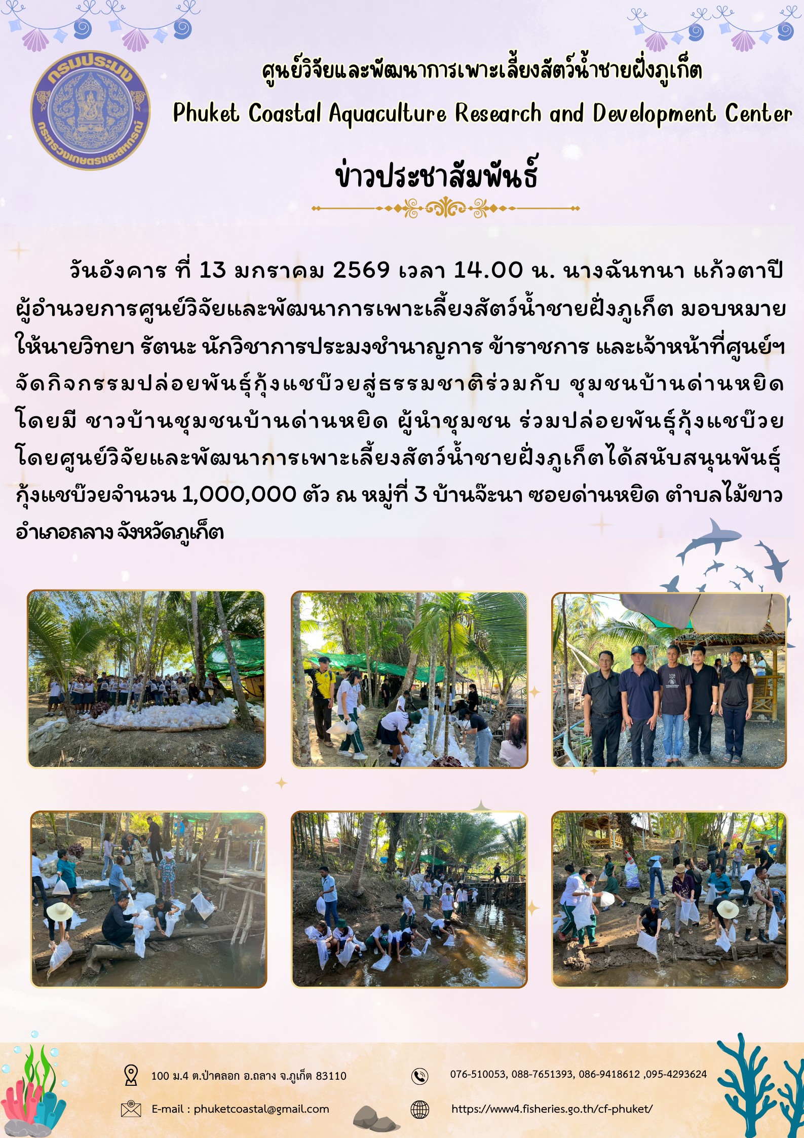 วันอังคาร ที่ 13 มกราคม 2569 เวลา 14.00 น. นางฉันทนา แก้วตาปี ผู้อำนวยการศูนย์วิจัยและพัฒนาการเพาะเลี้ยงสัตว์น้ำชายฝั่งภูเก็ต มอบหมายให้นายวิทยา รัตนะ นักวิชาการประมงชำนาญการ ข้าราชการ และเจ้าหน้าที่ศูนย์ฯ จัดกิจกรรมปล่อยพันธุ์กุ้งแชบ๊วยสู่ธรรมชาติร่วมกับ ชุมชนบ้านด่านหยิด โดยมี ชาวบ้านชุมชนบ้านด่านหยิด ผู้นำชุมชน ร่วมปล่อยพันธุ์กุ้งแชบ๊วยโดยศูนย์วิจัยและพัฒนาการเพาะเลี้ยงสัตว์น้ำชายฝั่งภูเก็ตได้สนับสนุนพันธุ์ กุ้งแชบ๊วยจำนวน 1,000,000 ตัว ณ หมู่ที่ 3 บ้านจ๊ะนา ซอยด่านหยิด ตำบลไม้ขาวอำเภอถลาง จังหวัดภูเก็ต