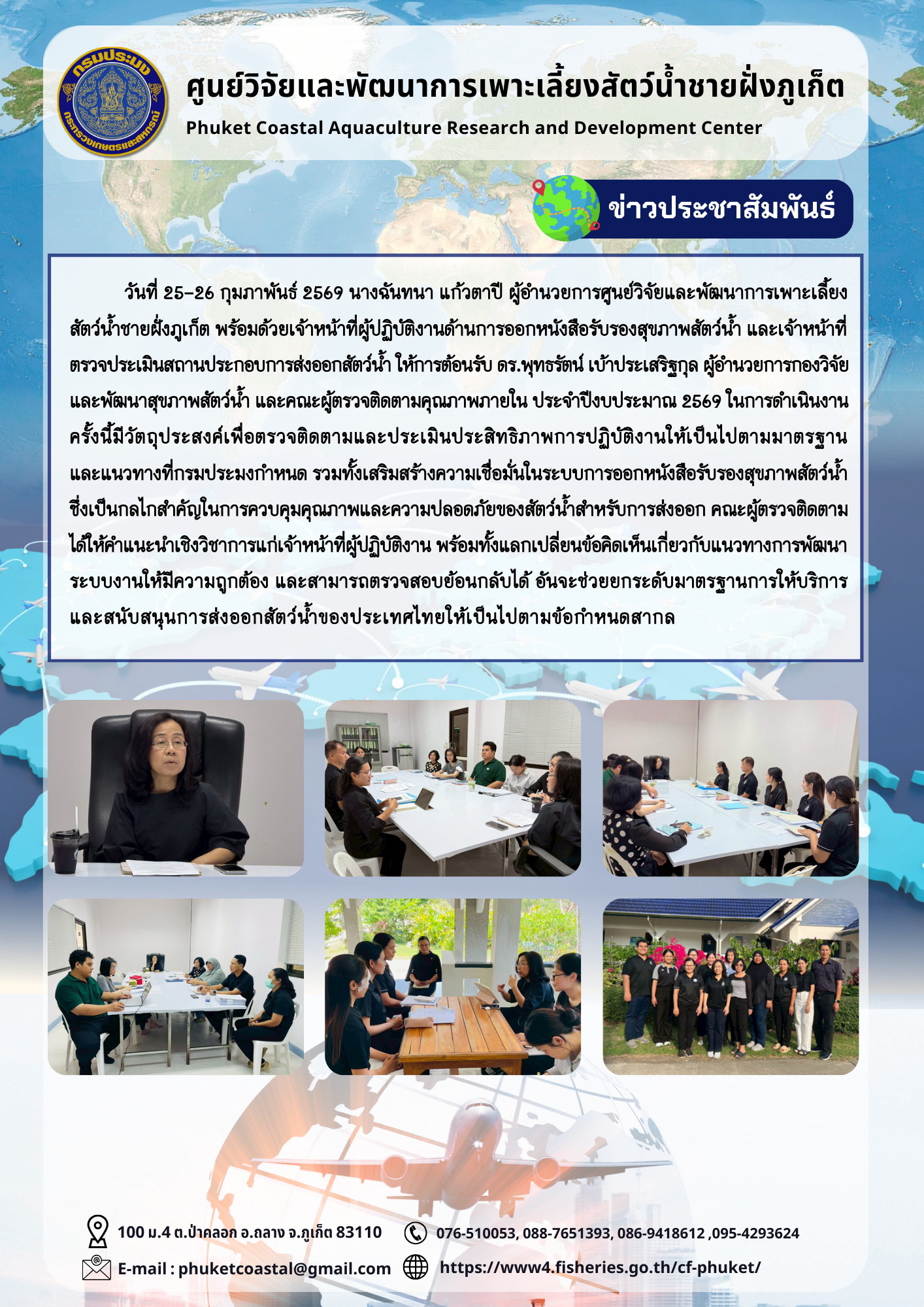 วันที่ 25-26 กุมภาพันธ์ 2569 นางฉันทนา แก้วตาปี ผู้อำนวยการศูนย์วิจัยและพัฒนาการเพาะเลี้ยงสัตว์น้ำชายฝั่งภูเก็ต พร้อมด้วยเจ้าหน้าที่ผู้ปฏิบัติงานด้านการออกหนังสือรับรองสุขภาพสัตว์น้ำ และเจ้าหน้าที่ตรวจประเมินสถานประกอบการส่งออกสัตว์น้ำ ให้การต้อนรับ ดร.พุทธรัตน์ เบ้าประเสริฐกุล ผู้อำนวยการกองวิจัยและพัฒนาสุขภาพสัตว์น้ำ และคณะผู้ตรวจติดตามคุณภาพภายใน ประจำปีงบประมาณ 2569 ในการดำเนินงานครั้งนี้มีวัตถุประสงค์เพื่อตรวจติดตามและประเมินประสิทธิภาพการปฏิบัติงานให้เป็นไปตามมาตรฐานและแนวทางที่กรมประมงกำหนด รวมทั้งเสริมสร้างความเชื่อมั่นในระบบการออกหนังสือรับรองสุขภาพสัตว์น้ำ ซึ่งเป็นกลไกสำคัญในการควบคุมคุณภาพและความปลอดภัยของสัตว์น้ำสำหรับการส่งออกคณะผู้ตรวจติดตามได้ให้คำแนะนำเชิงวิชาการแก่เจ้าหน้าที่ผู้ปฏิบัติงาน พร้อมทั้งแลกเปลี่ยนข้อคิดเห็นเกี่ยวกับแนวทางการพัฒนาระบบงานให้มีความถูกต้อง และสามารถตรวจสอบย้อนกลับได้ อันจะช่วยยกระดับมาตรฐานการให้บริการและสนับสนุนการส่งออกสัตว์น้ำของประเทศไทยให้เป็นไปตามข้อกำหนดสากล