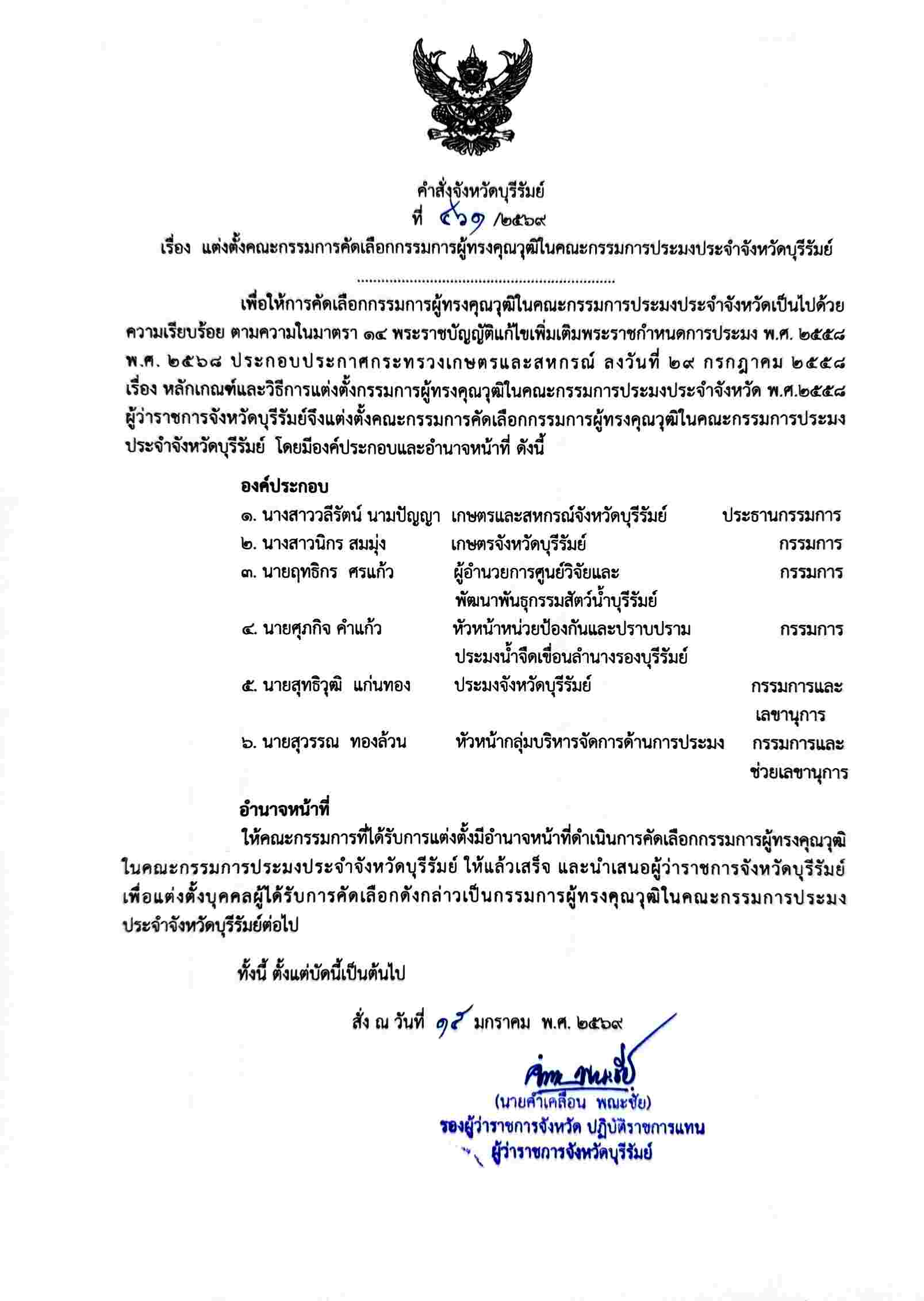 เรื่อง แต่งตั้งคณะกรรมการคัดเลือกกรรมการผู้ทรงคุณวุฒิในคณะกรรมการประมงประจำจังหวัดบุรีรัมย์