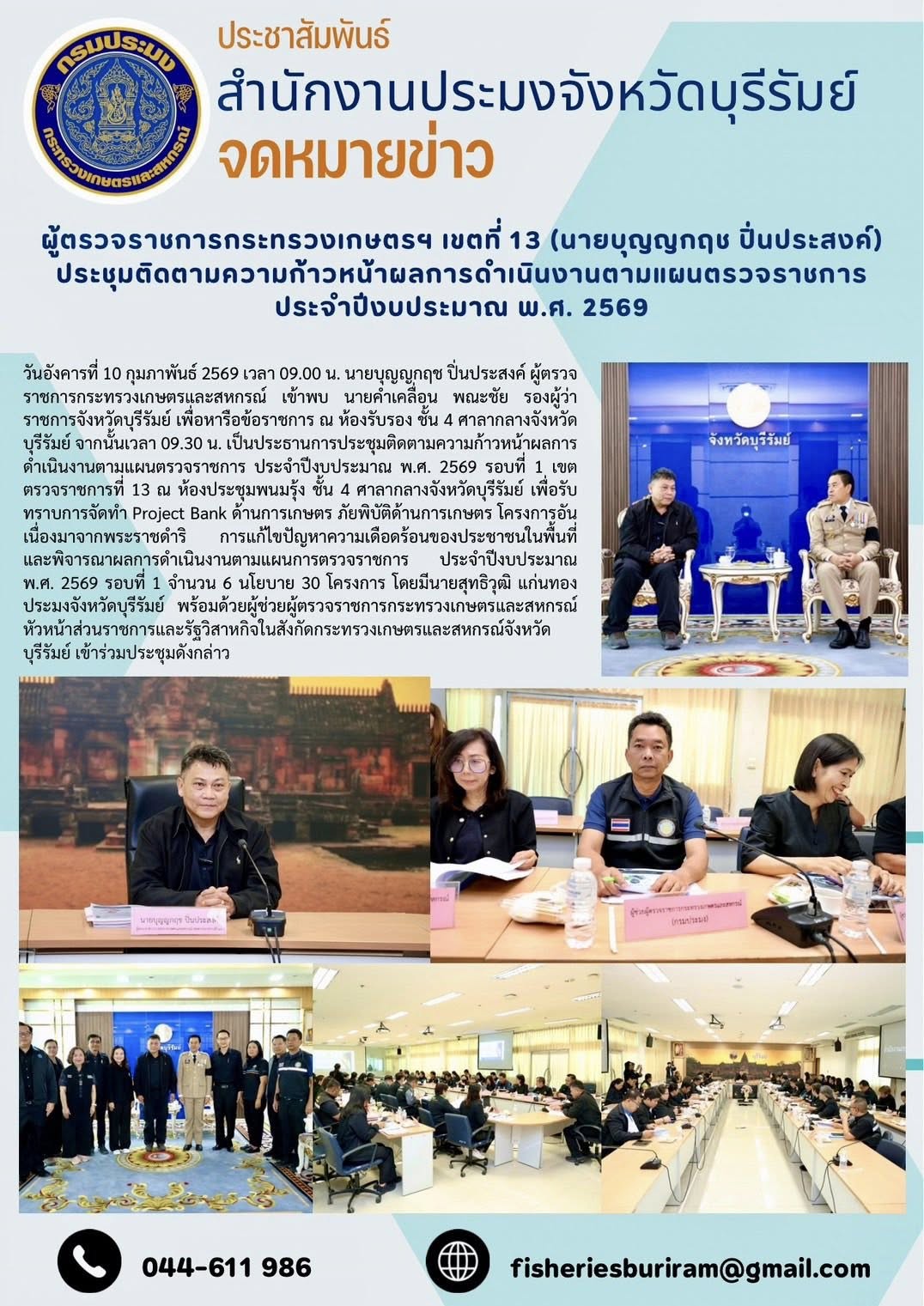 วันอังคารที่ 10 กุมภาพันธ์ 2569 เวลา 09.00 น. นายบุญญกฤช ปิ่นประสงค์ ผู้ตรวจราชการกระทรวงเกษตรและสหกรณ์ เข้าพบ นายคำเคลื่อน พณะชัย รองผู้ว่าราชการจังหวัดบุรีรัมย์ เพื่อหารือข้อราชการ ณ ห้องรับรอง ชั้น 4 ศาลากลางจังหวัดบุรีรัมย์ จากนั้นเวลา 09.30 น. เป็นประธานการประชุมติดตามความก้าวหน้าผลการดำเนินงานตามแผนตรวจราชการ ประจำปีงบประมาณ พ.ศ. 2569 รอบที่ 1 เขตตรวจราชการที่ 13 ณ ห้องประชุมพนมรุ้ง ชั้น 4 ศาลากลางจังหวัดบุรีรัมย์ เพื่อรับทราบการจัดทำ Project Bank ด้านการเกษตร ภัยพิบัติด้านการเกษตร โครงการอันเนื่องมาจากพระราชดำริ การแก้ไขปัญหาความเดือดร้อนของประชาชนในพื้นที่ และพิจารณาผลการดำเนินงานตามแผนการตรวจราชการ ประจำปีงบประมาณ พ.ศ. 2569 รอบที่ 1 จำนวน 6 นโยบาย 30 โครงการ โดยมีนายสุทธิวุฒิ แก่นทอง ประมงจังหวัดบุรีรัมย์ พร้อมด้วยผู้ช่วยผู้ตรวจราชการกระทรวงเกษตรและสหกรณ์ หัวหน้าส่วนราชการและรัฐวิสาหกิจในสังกัดกระทรวงเกษตรและสหกรณ์จังหวัดบุรีรัมย์ เข้าร่วมประชุมดังกล่าว