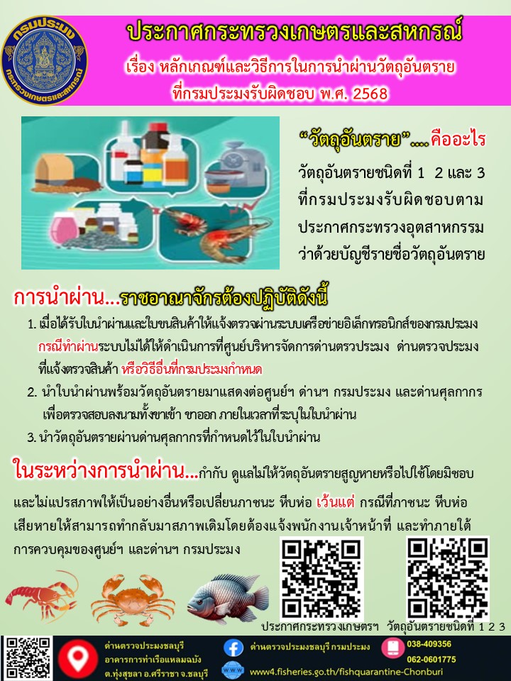 ประชาสัมพันธ์ประกาศกระทรวงเกษตรและสหกรณ์ เรื่อง หลักเกณฑ์และวิธีการในการนำผ่านวัตถุอันตรายที่กรมประมงรับผิดชอบ พ.ศ. 2568