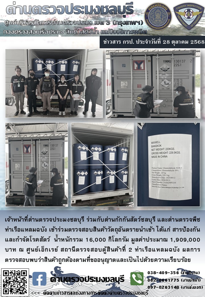 เจ้าหน้าที่ด่านตรวจประมงชลบุรี ร่วมกับด่านกักกันสัตว์ชลบุรี และด่านตรวจพืชท่าเรือแหลมฉบัง เข้าร่วมตรวจสอบสินค้าวัตถุอันตรายนำเข้า ได้แก่ สารป้องกันและกำจัดโรคสัตว์ น้ำหนักรวม 16,000 ก.ก. มูลค่าประมาณ 1,909,000 บาท ณ ศูนย์เอกซเรย์ สถานีตรวจสอบตู้สินค้าที่ 2 ท่าเรือแหลมฉบัง ผลการตรวจสอบพบว่าสินค้าถูกต้องตามที่ขออนุญาต และเป็นไปด้วยความเรียบร้อย