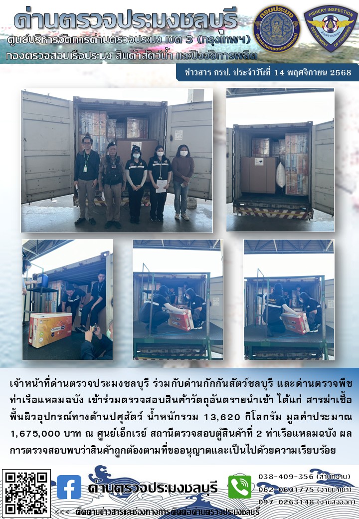 เจ้าหน้าที่ด่านตรวจประมงชลบุรี ร่วมกับด่านกักกันสัตว์ชลบุรี และด่านตรวจพืชท่าเรือแหลมฉบัง เข้าตรวจสอบสินค้าวัตถุอันตรายนำเข้า ได้แก่ สารฆ่าเชื้อพื้นผิว อุปกรณ์ทางด้านปศุสัตว์ น้ำหนักรวม 13,620 กิโลกรัม มูลค่าประมาณ 1,675,000 บาท ณ ศูนย์เอกซเรย์ สถานีตรวจสอบตู้สินค้าที่ 2 ท่าเรือแหลมฉบัง ผลการตรวจสอบพบว่าสินค้าถูกต้องตามที่ขออนุญาต และเป็นไปด้วยความเรียบร้อย