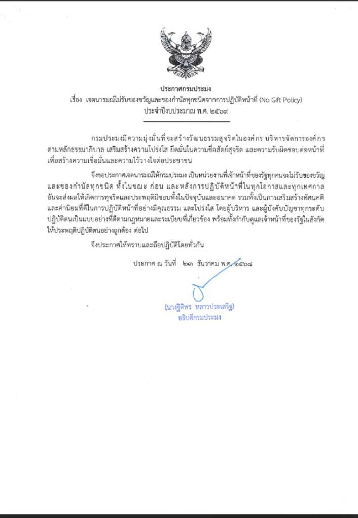 กรมประมงประกาศเจตนารมณ์ No Gift Policy ??? ไม่รับของขวัญและของกำนัลทุกชนิดจากการปฏิบัติหน้าที่ ประจำปีงบประมาณ พ.ศ. 2569 เพื่อเสริมสร้างค่านิยมด้านความซื่อสัตย์สุจริต ความประหยัด สร้างทัศนคติที่ถูกต้อง และป้องกันการเกิดผลประโยชน์ทับซ้อน อันอาจนำไปสู่การทุจริตในภาครัฐ??????