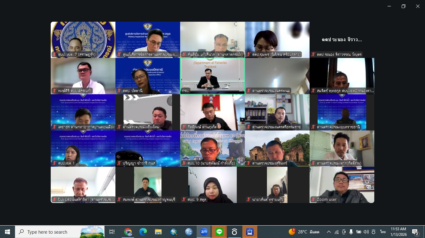 วันที่ 13 มกราคม 2569 เวลา 09.30 น. ข้าราชการ พนักงานราชการ และเจ้าหน้าที่ในสังกัดด่านตรวจประมงชลบุรี เข้าร่วมประชุมกองตรวจสอบเรือประมง สินค้าสัตว์น้ำ และปัจจัยการผลิต ครั้งที่ 1/2569 ผ่านระบบ Zoom Meeting โดยที่ประชุมได้กล่าวถึงการดำเนินการตามกฎหมายว่าด้วยการคุ้มครองสัตว์ทะเลเลี้ยงลูกด้วยนม (MMPA) สหรัฐอเมริกา กฎระเบียบใหม่ของสหภาพยุโรปว่าด้วยการป้องกัน บับยั้ง และขจัดการทำประมงที่ผิดกฎหมาย ขาดการรายงาน และไร้การควบคุม (IUU Fishing) ผลการประชุมเป็นไปด้วยความเรียบร้อย