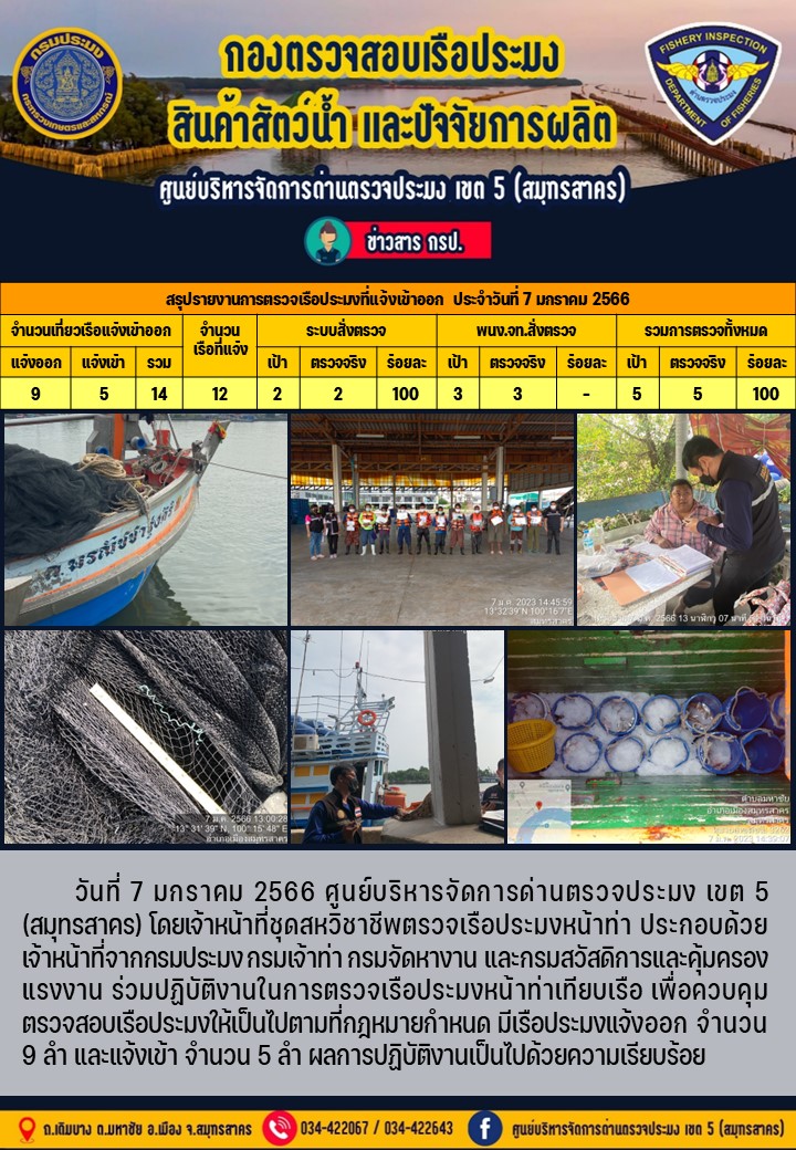 รายงานการตรวจเรือประมงที่แจ้งเข้าออกประจำวันที่ 7 มกราคม 2566