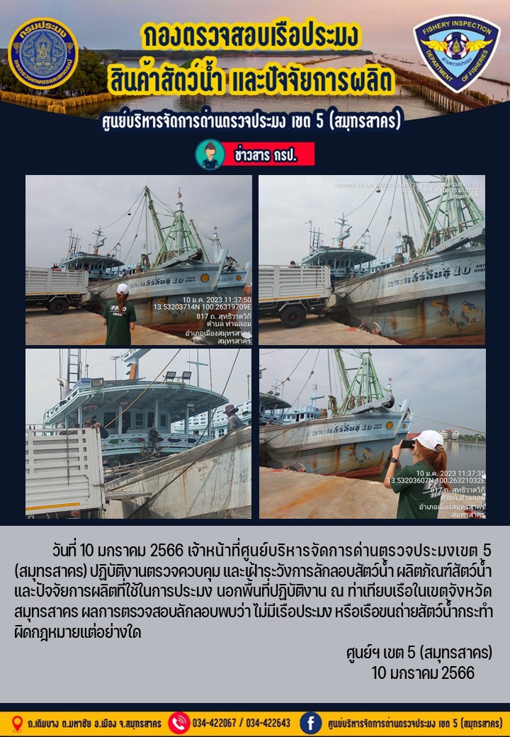 งานตรวจควบคุม และเฝ้าระวังการลักลอบสัตว์น้ำ ผลิตภัณฑ์สัตว์น้ำ และปัจจัยการผลิตที่ใช้ในการประมง นอกพื้นที่ปฏิบัติงาน ณ ท่าเทียบเรือในเขตจังหวัดสมุทรสาคร