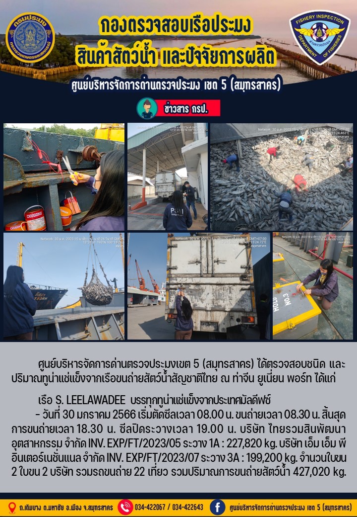 การตรวจสอบเรือขนถ่ายไทยชื่อ S. LEELAWADEE รับปลาทูน่าแช่แข็งจากประเทศมัลดีฟส์ แจ้งเข้าวันที่ 30 มกราคม 2566