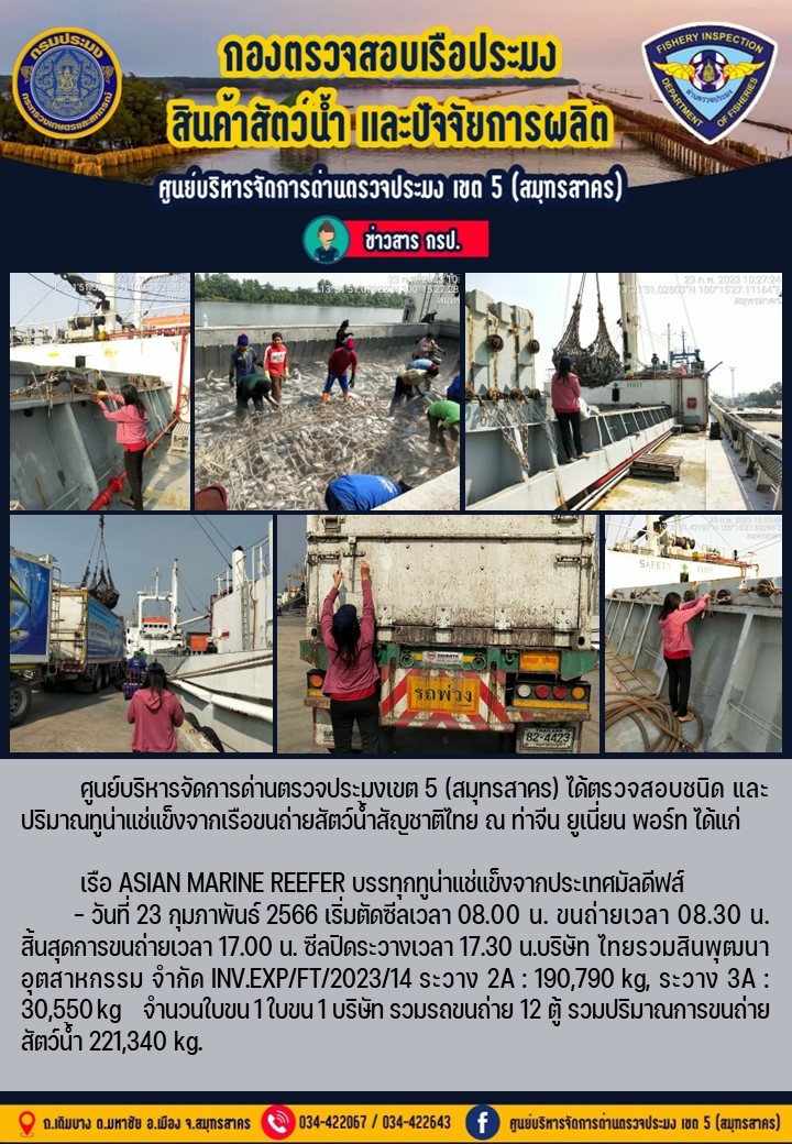 การขนถ่ายทูน่าแช่แข็งจากเรือขนถ่ายสัตว์น้ำสัญชาติไทย เรือ ASIAN MARINE REEFER บรรทุกทูน่าแช่แข็งจากประเทศมัลดีฟส์ วันที่ 23 กุมภาพันธ์ 2566