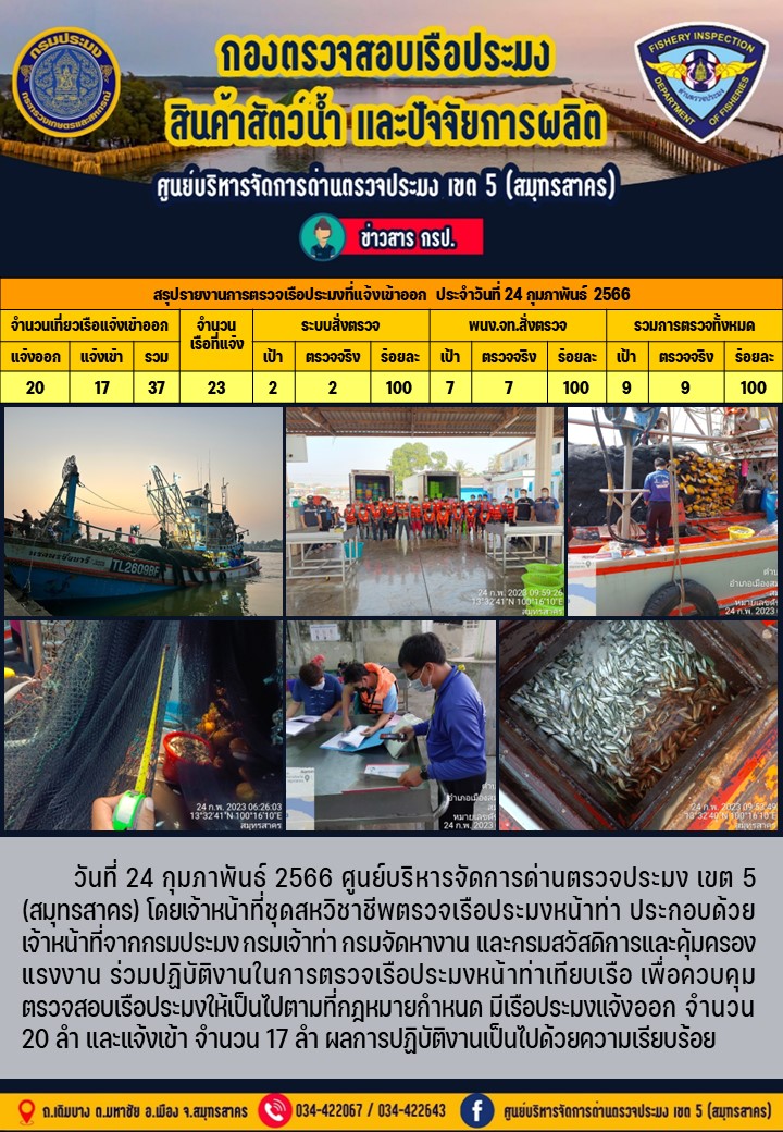 รายงานการตรวจเรือประมงที่แจ้งเข้าออกประจำวันที่ 24 กุมภาพันธ์ 2566