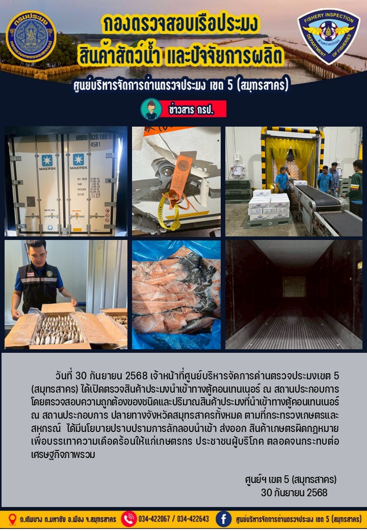 วันที่ 30 กันยายน 2568 เจ้าหน้าที่ศูนย์บริหารจัดการด่านตรวจประมงเขต5 (สมุทรสาคร) ได้เปิดตรวจสินค้าประมงนำเข้าทางตู้คอนเทนเนอร์ ณ สถานประกอบการ