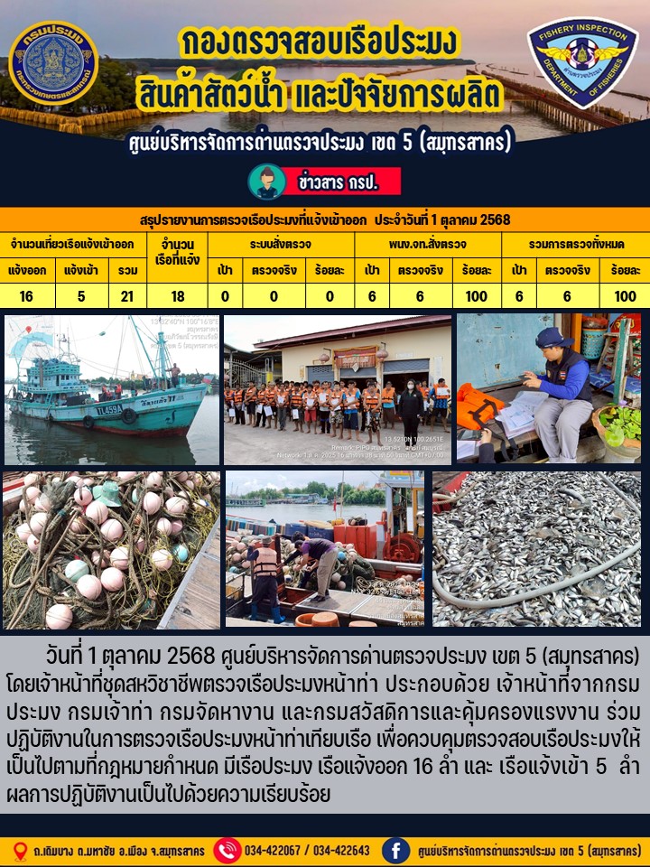 รายงานการตรวจเรือประมงที่แจ้งเข้าออกประจำวันที่ 1 ตุลาคม 2568