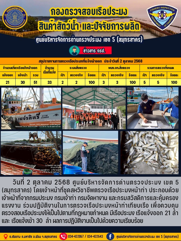รายงานการตรวจเรือประมงที่แจ้งเข้าออกประจำวันที่ 2 ตุลาคม 2568