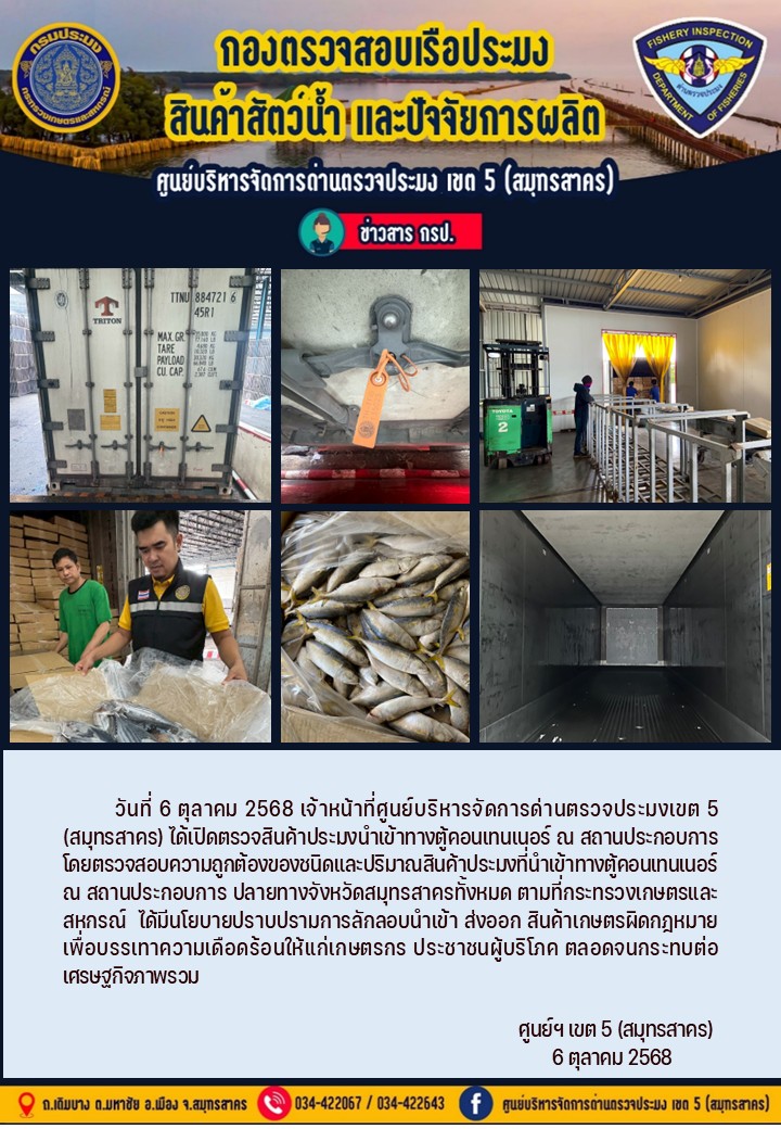 วันที่ 6 ตุลาคม 2568 เจ้าหน้าที่ศูนย์บริหารจัดการด่านตรวจประมงเขต5 (สมุทรสาคร) ได้เปิดตรวจสินค้าประมงนำเข้าทางตู้คอนเทนเนอร์ ณ สถานประกอบการ
