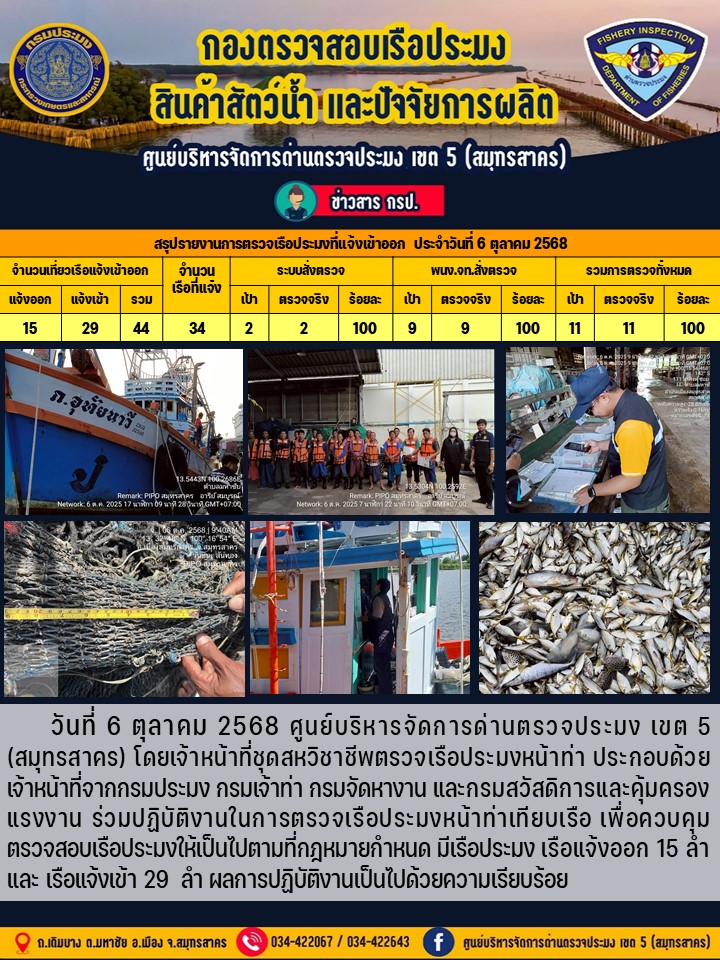 รายงานการตรวจเรือประมงที่แจ้งเข้าออกประจำวันที่ 6 ตุลาคม 2568