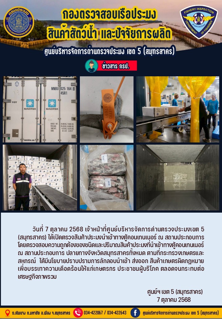 วันที่ 7 ตุลาคม 2568 เจ้าหน้าที่ศูนย์บริหารจัดการด่านตรวจประมงเขต5 (สมุทรสาคร) ได้เปิดตรวจสินค้าประมงนำเข้าทางตู้คอนเทนเนอร์ ณ สถานประกอบการ