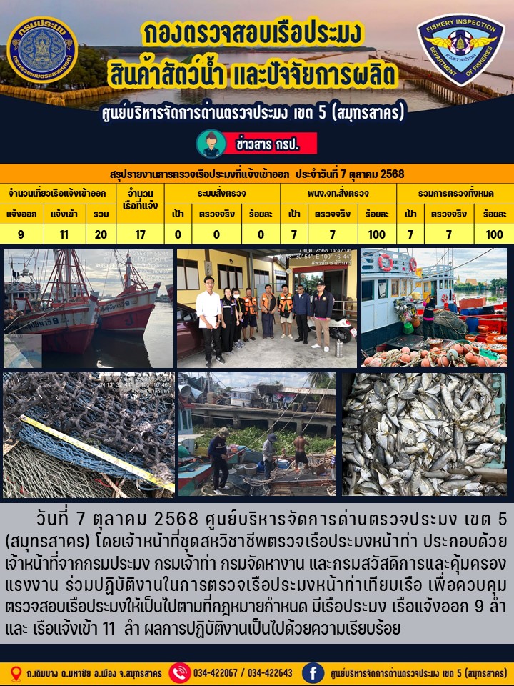 รายงานการตรวจเรือประมงที่แจ้งเข้าออกประจำวันที่ 7 ตุลาคม 2568