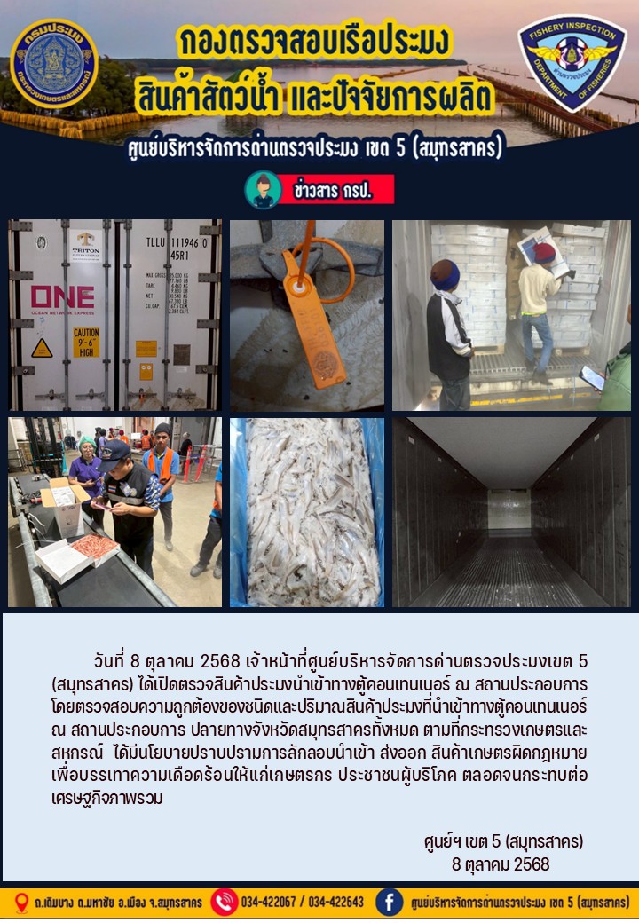วันที่ 8 ตุลาคม 2568 เจ้าหน้าที่ศูนย์บริหารจัดการด่านตรวจประมงเขต5 (สมุทรสาคร) ได้เปิดตรวจสินค้าประมงนำเข้าทางตู้คอนเทนเนอร์ ณ สถานประกอบการ