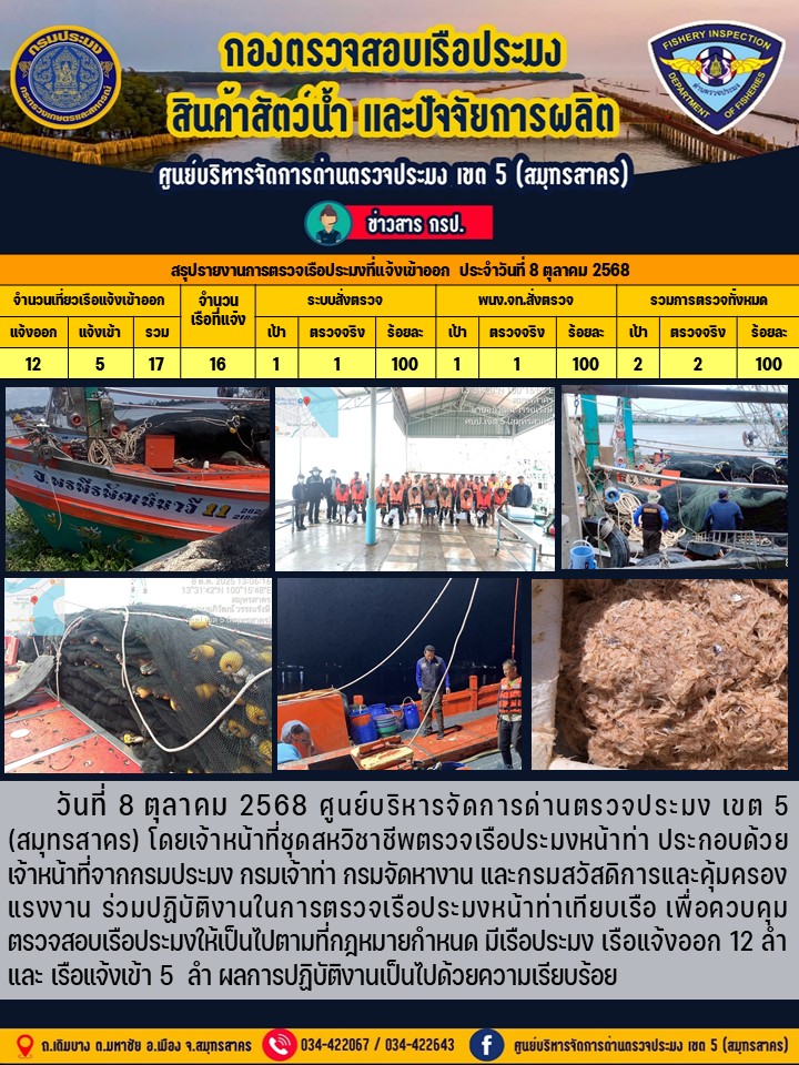 รายงานการตรวจเรือประมงที่แจ้งเข้าออกประจำวันที่ 8 ตุลาคม 2568