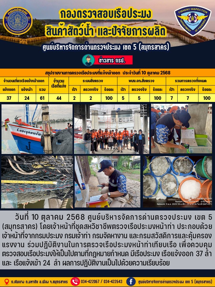 รายงานการตรวจเรือประมงที่แจ้งเข้าออกประจำวันที่ 10 ตุลาคม 2568