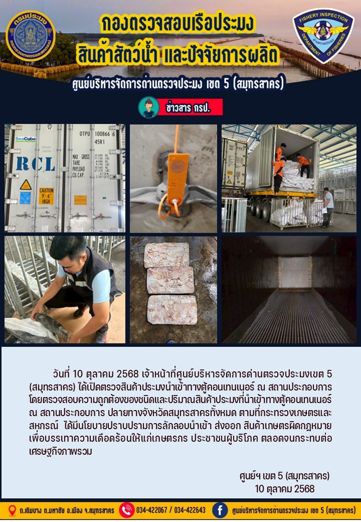 วันที่ 10 ตุลาคม 2568 เจ้าหน้าที่ศูนย์บริหารจัดการด่านตรวจประมงเขต5 (สมุทรสาคร) ได้เปิดตรวจสินค้าประมงนำเข้าทางตู้คอนเทนเนอร์ ณ สถานประกอบการ